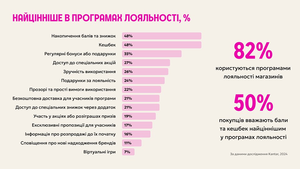 Серед 82% клієнтів, які користуються програмами лояльності, 50% покупців вважають бали та кешбек найціннішим.