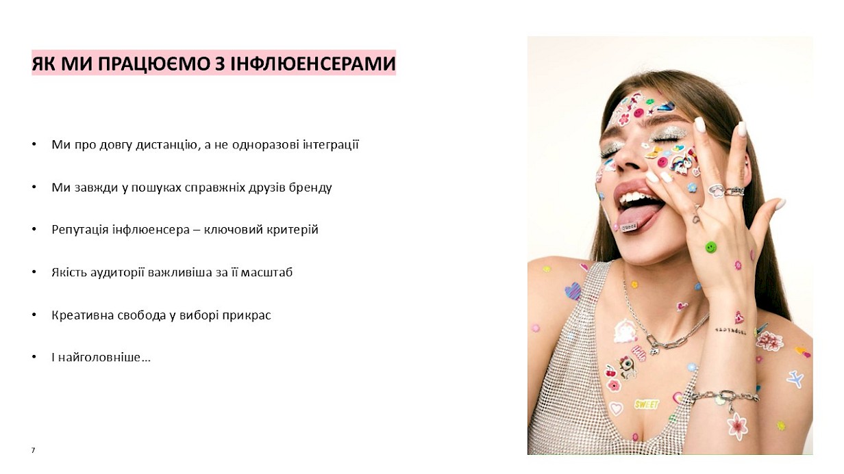 Ми будуэмо довгострокові стосунки та знаходити саме друзів бренду, цінності яких збігаються з цінностями бренду. Також для нас важливо не кількість підписників, а репутація інфлюенсера, як він комунікує зі своєю аудиторією в різні періоди свого життя, зокрема, і кризові. Важлива якість контенту і підписників.