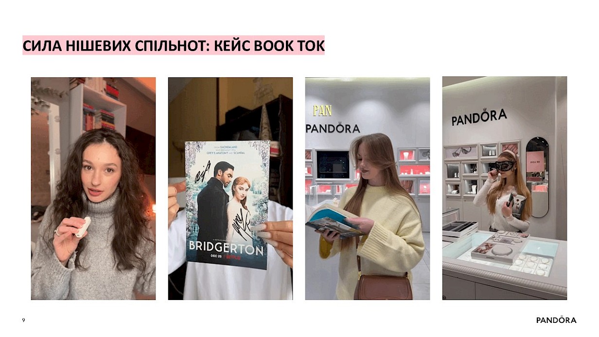 Ще один кейс – вирішили піти до буктокерів – це нішева спільнота, яка дуже якісно комунікує зі своєю аудиторією. Не багато брендів до них йдуть, а ми пішли. Цієї зими у нас був запуск колаборації Pandora та Bridgerton. Ми покликали буктокерів в магазини. Вийшла дуже органічна та нативна реклама бренду для аудиторії, яка напряму не зацікавлена в рекламі ювелірних прикрас «лоб в лоб». Тож моя порада – тестувати дуже різні аудиторії.