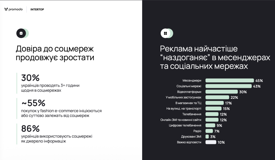 Фундаментом успіху Intertop є накопичений роками соціальний капітал, адже будь-які технічні налаштування рекламних кабінетів залишалися б неефективними без потужного та впізнаваного бренду. Для компанії соціальні мережі давно трансформувалися з розважального майданчика у стратегічне джерело інформації, яким користуються 86% клієнтів, причому першочергову роль тут відіграє візуальний аспект, оскільки в сегменті fashion споживач завжди обирає очима.