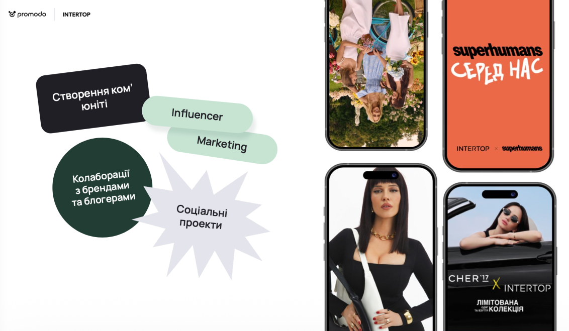 Компанія робить ставку на стратегічні колаборації, які стають головними інфоприводами в соціальних мережах і драйвером емоційних продажів. Протягом двох сезонів Intertop успішно реалізує масштабне партнерство з амбасадоркою Дашею Квітковою, що дозволяє залучати лояльну жіночу аудиторію. Окремим помітним кейсом стала співпраця з Дашею Астаф’євою та брендом Cher’17. Для просування цієї лінійки було використано інноваційний формат - ексклюзивний TikTok-серіал, який забезпечив високі показники органічного охоплення та залученості завдяки нативному сторітелінгу.