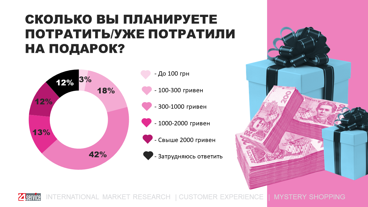 На квіти планують витратити суму від 100 до 300 грн (52%), а на ювелірні вироби – понад 2000 грн – 58% респондентів. 48% українців оберуть одяг і взуття від 300 до 1000 грн в якості подарунка.