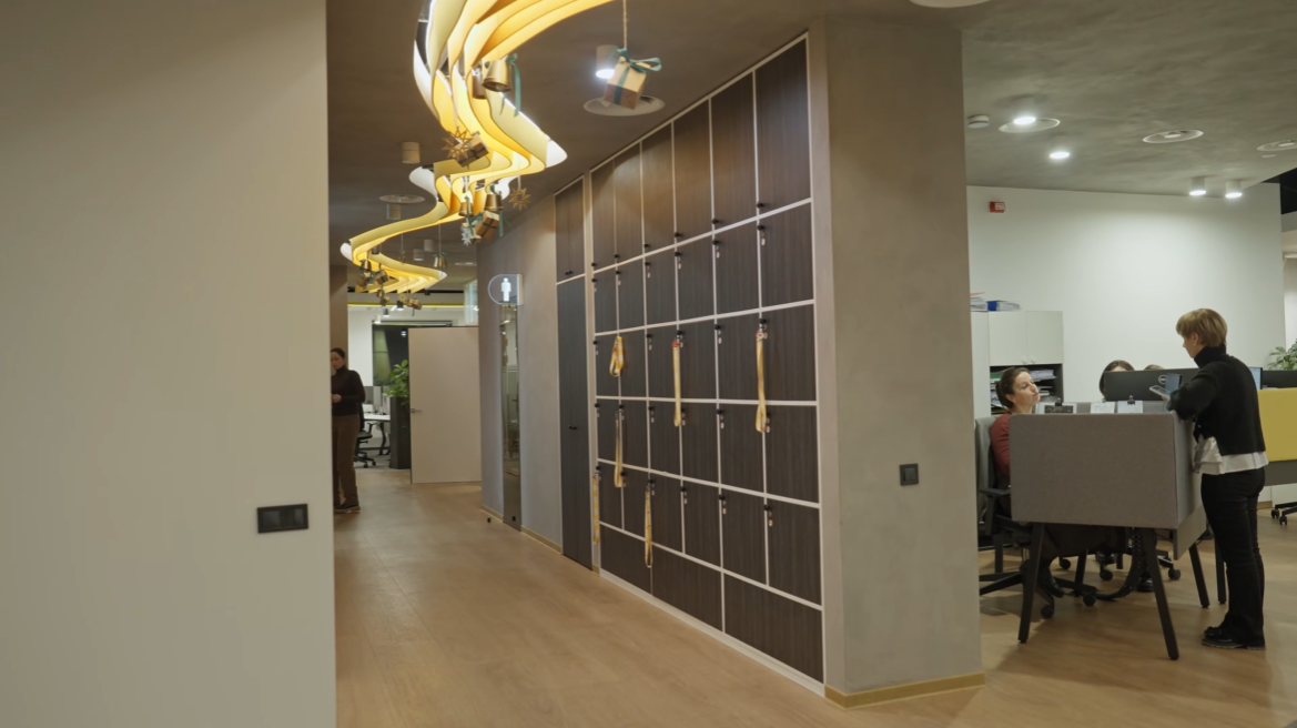 – Це локери для чистих столів. Ти кожен день можеш сидіти в іншому місці, тому в кінці дня ти маєш все зібрати і закрити в локері. Щоб завтра, в залежності від того, який в тебе робочий день, ти міг сісти зовсім з іншими людьми.