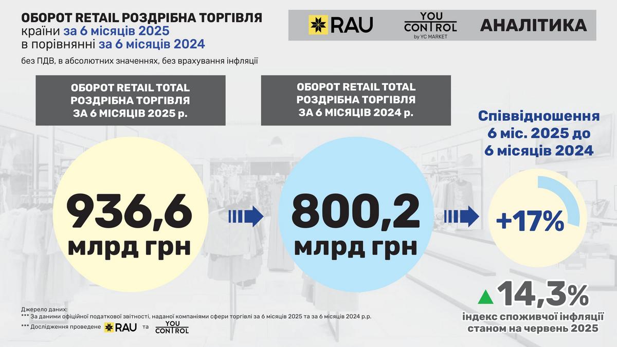 Як показали результати дослідження RAU, проведеного спільного з YouControl (продукт YС.Market) по оборотах галузі, за перші шість місяців поточного року українські ритейлери загалом отримали виторг 936,6 млрд грн. Для порівняння: минулого року за аналогічний період цей показник склав 800,2 млрд грн. В абсолютних цифрах, тобто без урахування впливу інфляції (а також без урахування ПДВ), обороти ритейлерів за два квартали 2025 року перевищили ті самі показники 2024-го на 17%. І це виглядає як доволі суттєвий приріст.