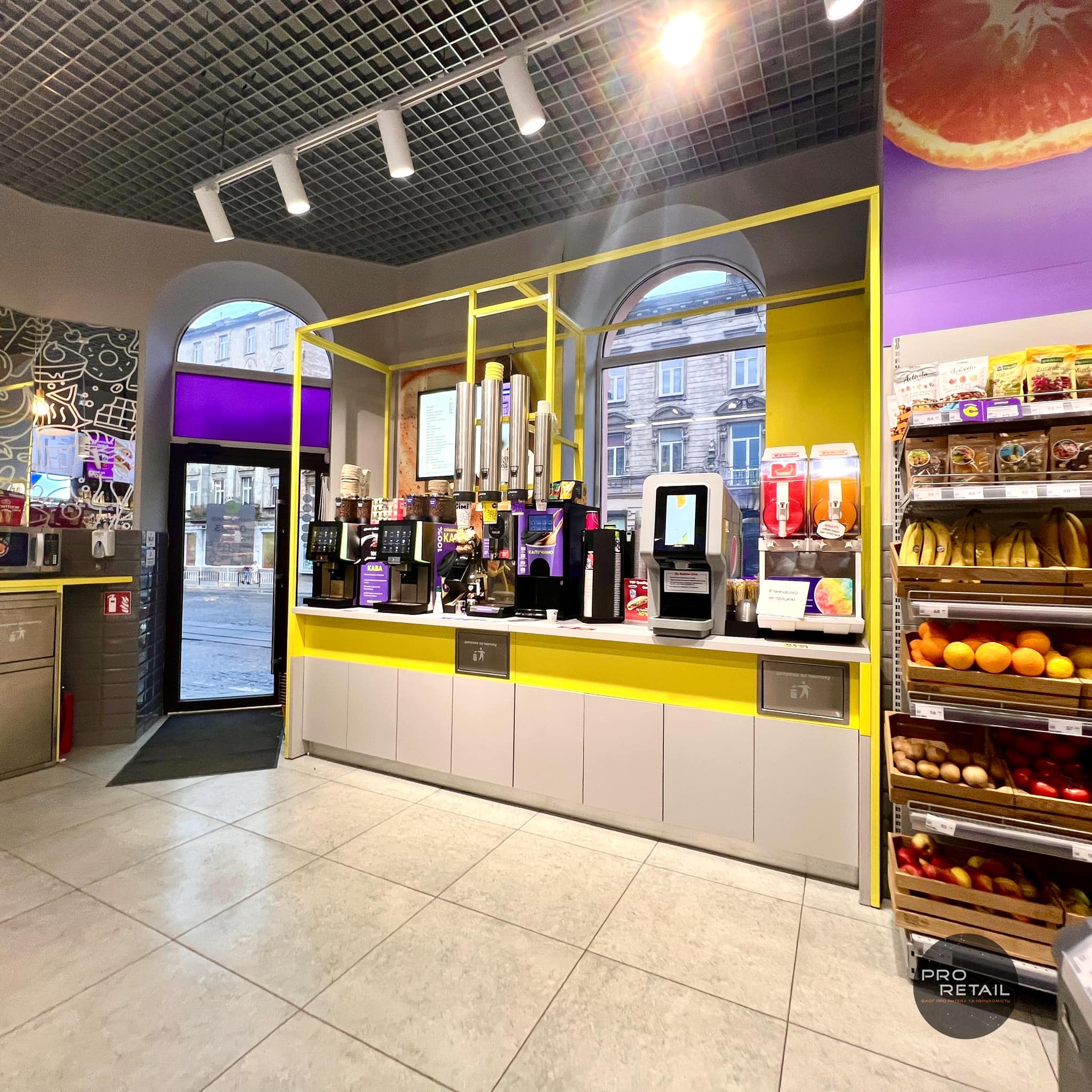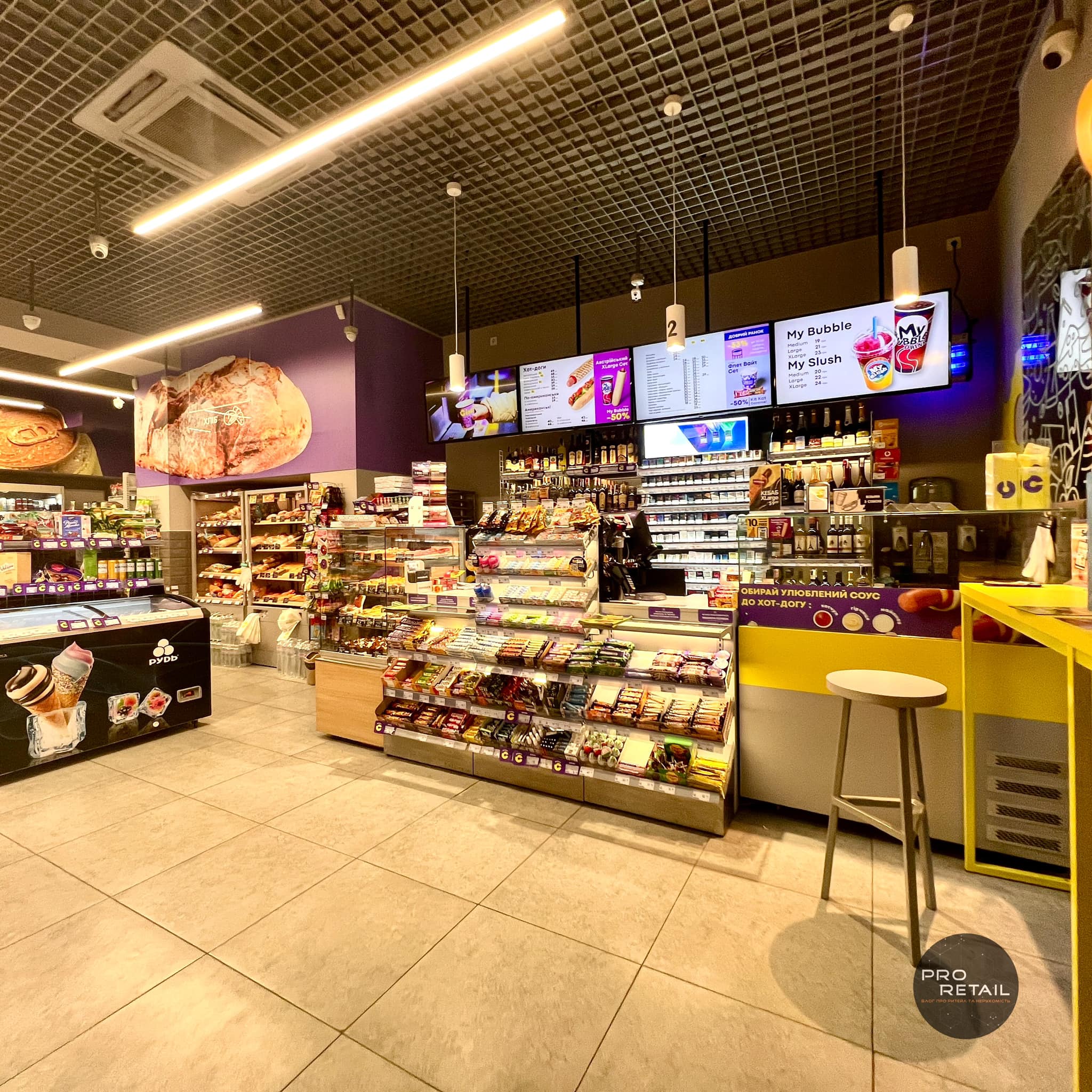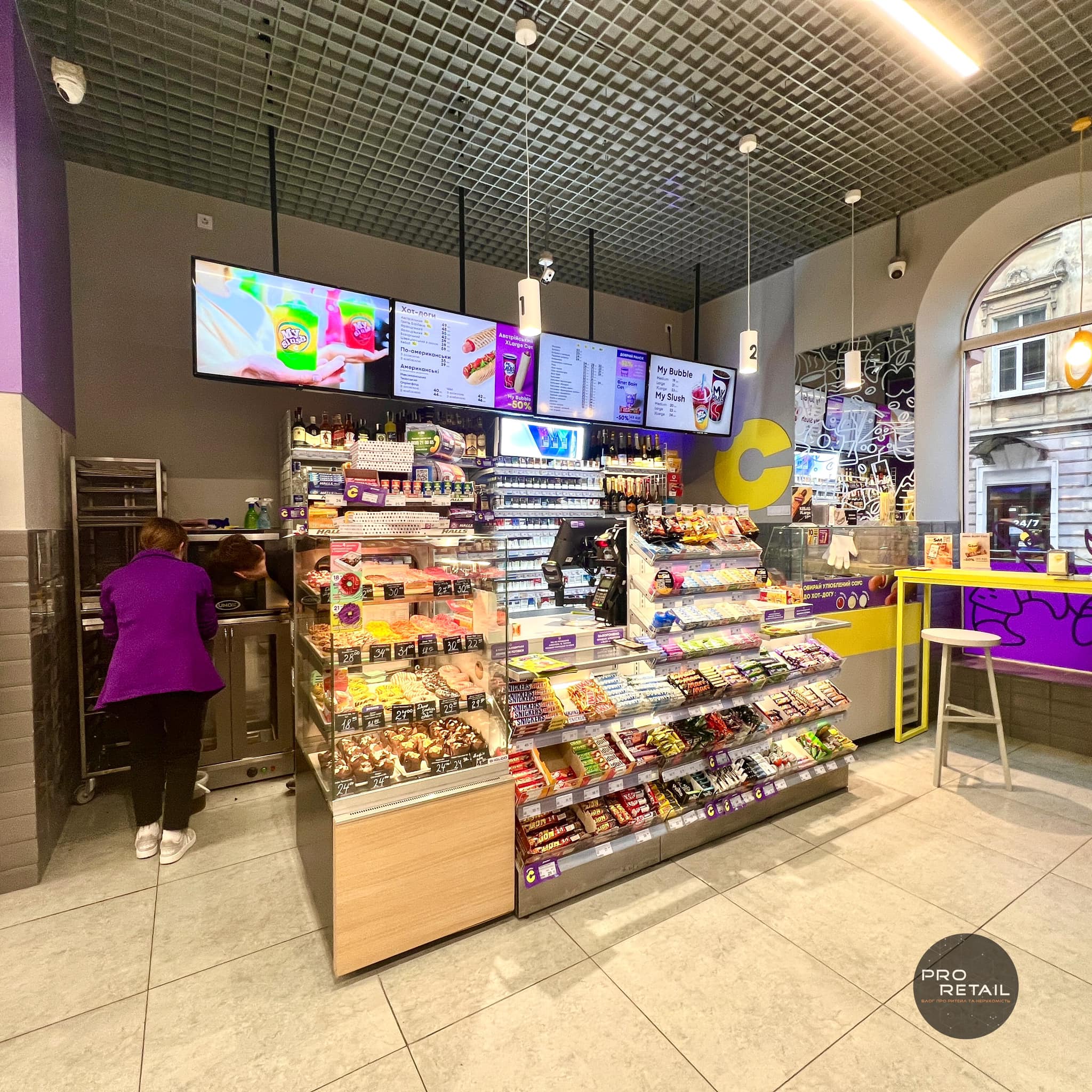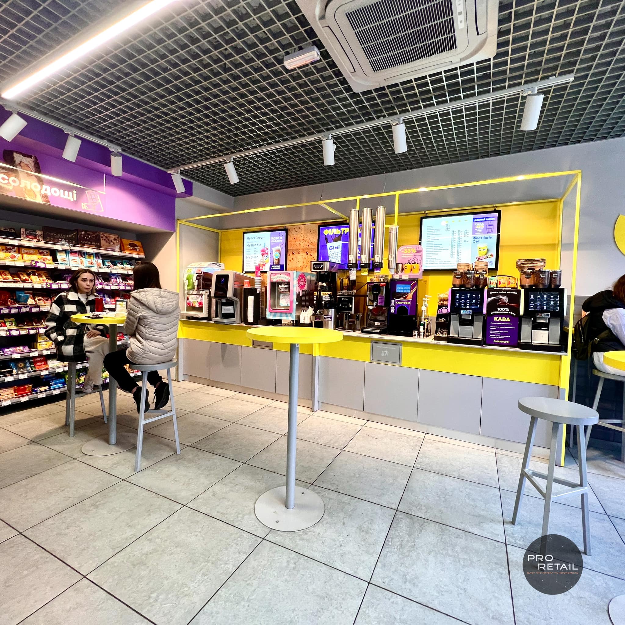 Компактний формат, багато фаст-фуду, автомати самообслуговування і бузково-жовта гамма, – як виглядає новий формат зручних маркетів Сімі від Клевер Сторс.