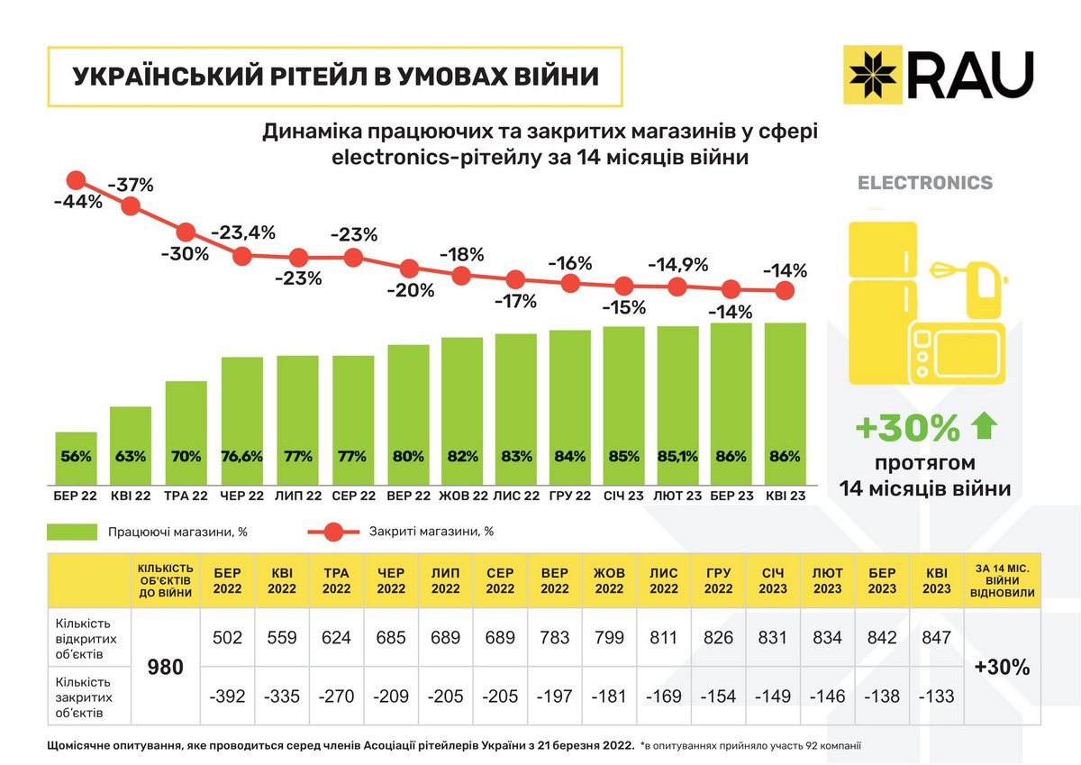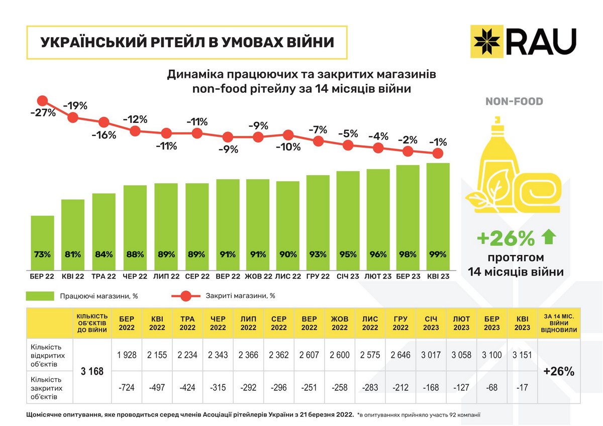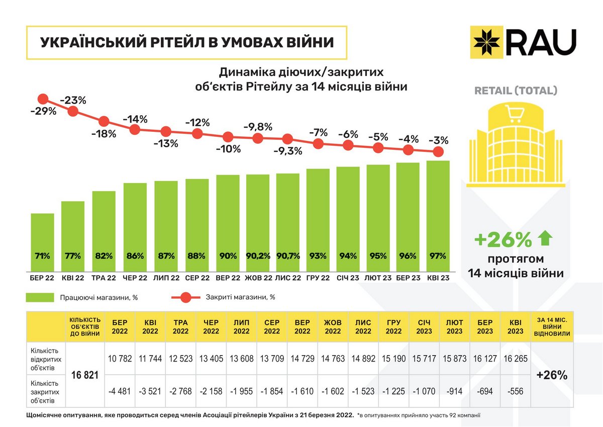 Як показало щомісячне дослідження, яке регулярно проводиться серед членів Асоціації рітейлерів України з 21 березня 2022 року методом онлайн-опитування приблизно сотні власників та CEO підприємств по всій Україні, наразі закритими лишається тільки 3% торгових об’єктів/магазинів. За 14 місяців війни цей показник зменшився на 26%.