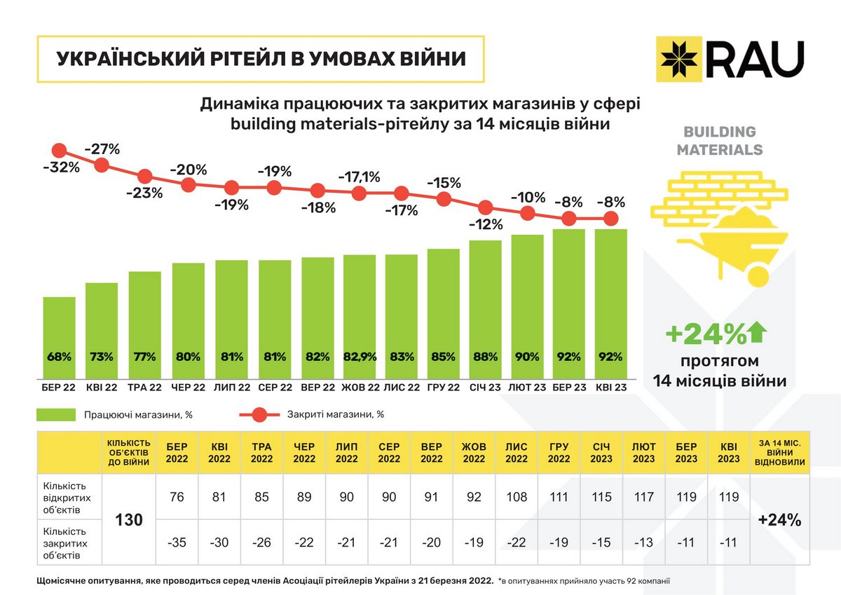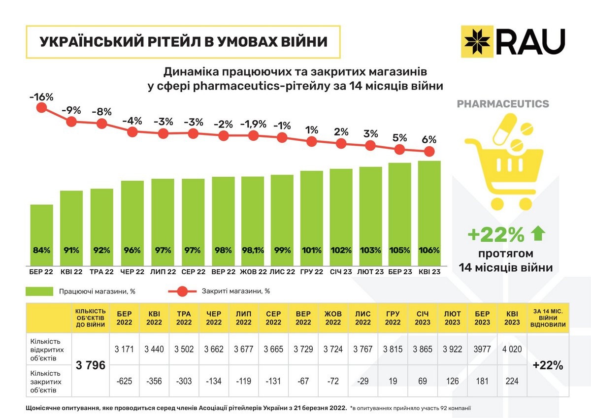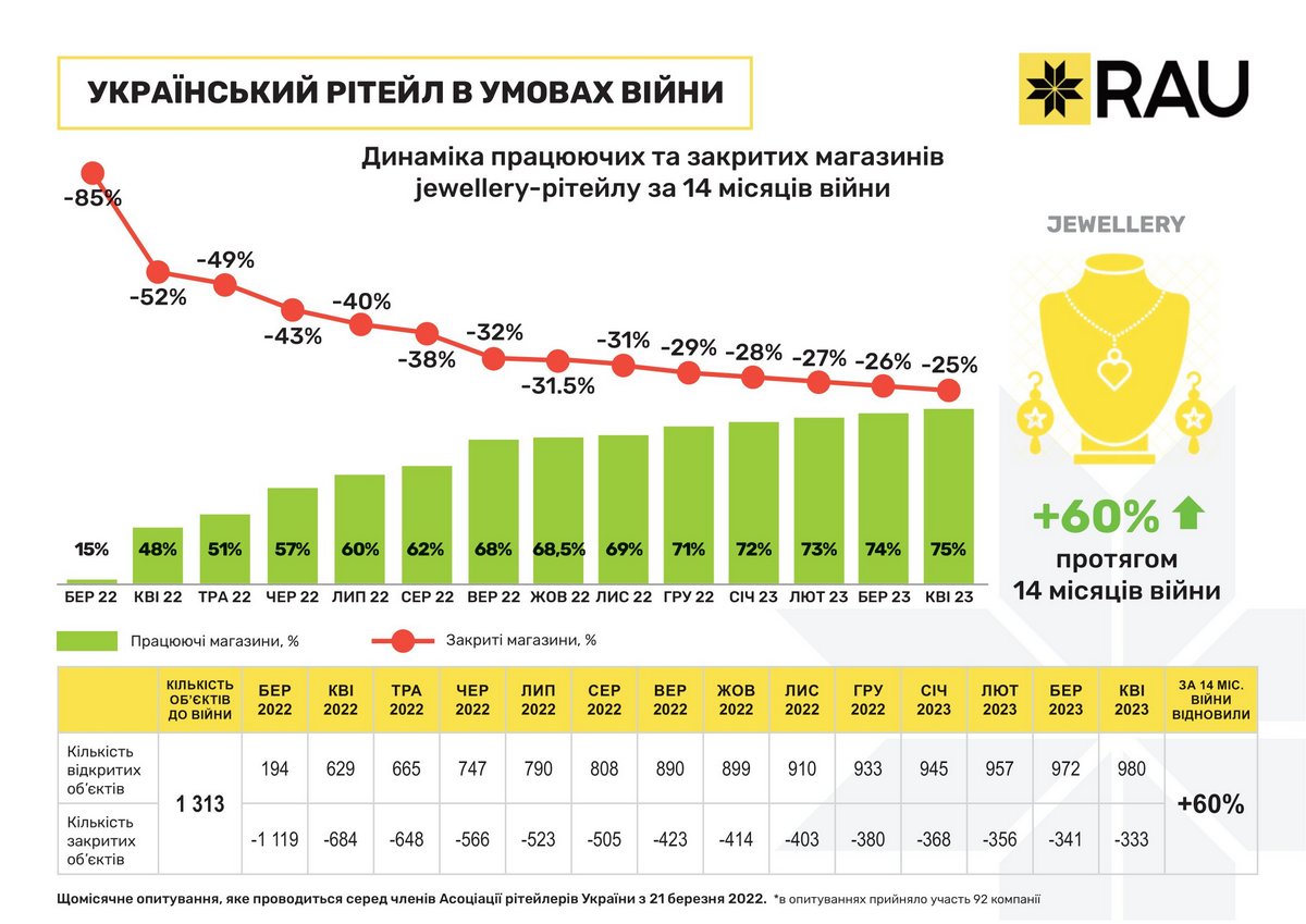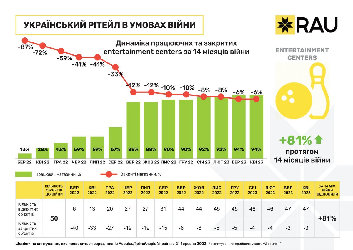 Як показало щомісячне дослідження, яке регулярно проводиться серед членів Асоціації рітейлерів України з 21 березня 2022 року методом онлайн-опитування приблизно сотні власників та CEO підприємств по всій Україні, наразі закритими лишається тільки 3% торгових об’єктів/магазинів. За 14 місяців війни цей показник зменшився на 26%.