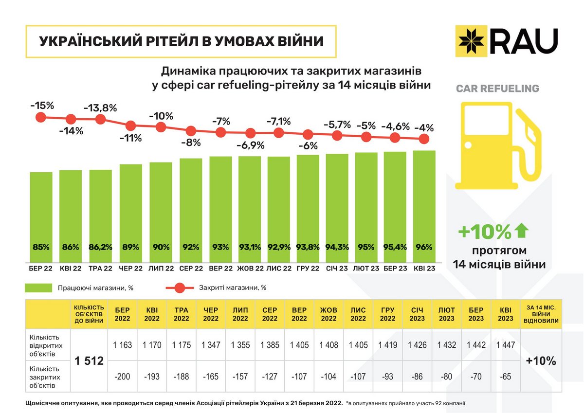 Торгівля паливом затребувана завжди й тому здебільшого закриття близько 200 заправок (або 15%) із 1512, які працювали до війни, було пов’язано перш за все руйнуваннями або окупацією ворогом. Відповідно, по мірі звільнення територій та відновлення функціонування вцілілих АЗК, процент працюючих заправок поступово нарощувався. В середньому за місяць відкривалося від 5 до 7 АЗК. Виключенням стали червень, серпень та вересень, коли запускалися в роботу по два десятки і більше заправок. Так само поступово іде відновлення АЗК і цього року. Станом на квітень вже працювало 1447 точок або 96% від довоєнної кількості. Тобто з березня 2022-го по квітень 2023-го частка працюючих об’єктів мереж АЗК зросла на 10%. Зокрема, за січень-квітень цього року відкрилося ще 28 АЗК і наразі лишається закритими тільки 65 заправок.