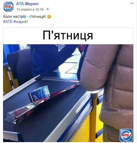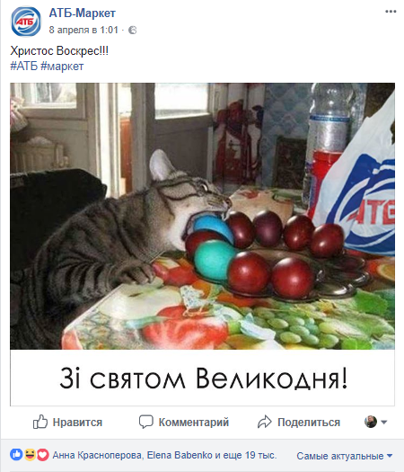 І звичайно ж ось уже згаданий вище великодній жарт від АТБ-маркет. Прифотошоплений пакет надав зображенню фірмовості і подарував мережі дискаунтерів приголомшливі 19 000 лайків. Котики, Великдень, пакет АТБ – все те, що так люблять шанувальники рітейлера.