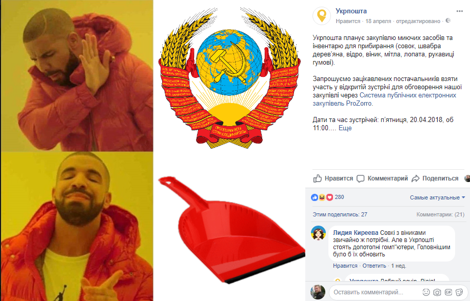 Як за допомогою мема в одній публікації оголосити тендер і пожартувати над СРСР? Укрпошта знайшли спосіб. Мем «Дрейк в помаранчевій куртці» з канадським репером Drake, став популярний на Reddit (соціальний новинний сайт, на якому зароджується більшість відомих інтернет-мемів, – прим. ред.) у 2015 році. Самі кадри взяті з його кліпу на пісню «Hotline Bling».