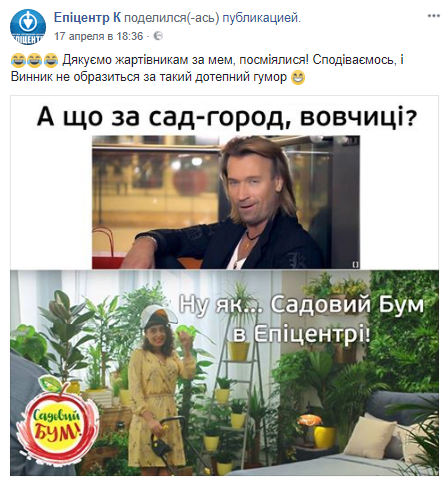 Чисто українським мемом порадував у цьому місяці Епіцентр К. Жарти про “молоду вовчицю” з пісні Олега Винника гуляють UAnet вже кілька місяців і чергове звернення до творчості і чарівності улюбленця жінок 40+ швидко знайшла свою аудиторію.