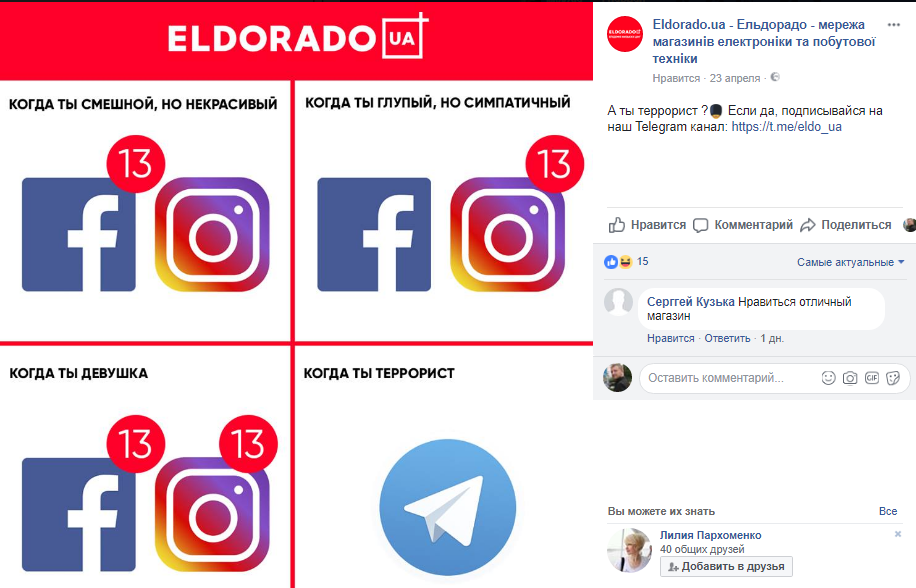 Ті, кому не сподобалася жарт про “вбитий цвях у спину недруга” від Епіцентру К, насправді не бачив жарти Eldorado “А ти терорист ?️ Якщо так, підписуйся на наш Telegram канал”. Заборона”найзахищенішого в світі мессенджера” Telegram в РФ теж привід для гумору, а чому б і ні? Відгук аудиторії, втім, виявився трохи слабкий.