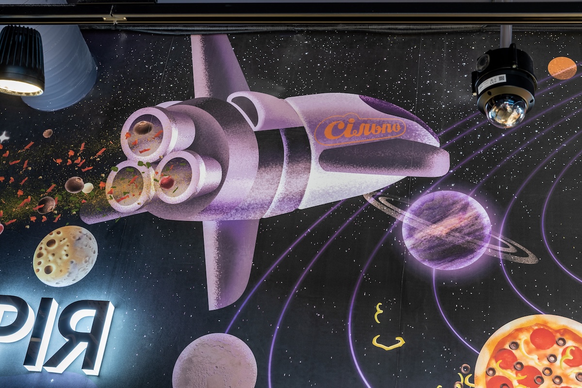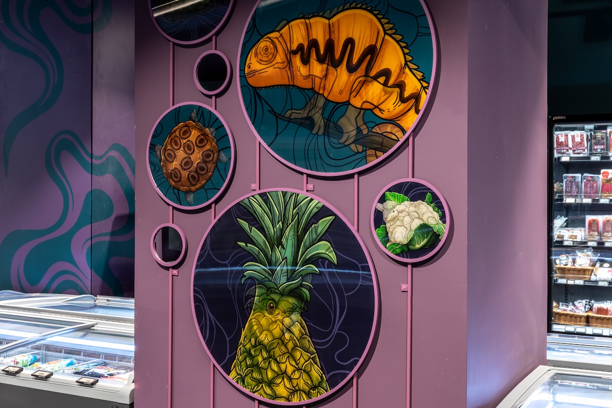 Дизайн магазину поєднує в собі сюрреалізм і неочікувані трансформації: від овочів, що перетворюються на тварин, до фантазійних сцен із космосу та коконів, з яких з’являються метелики.