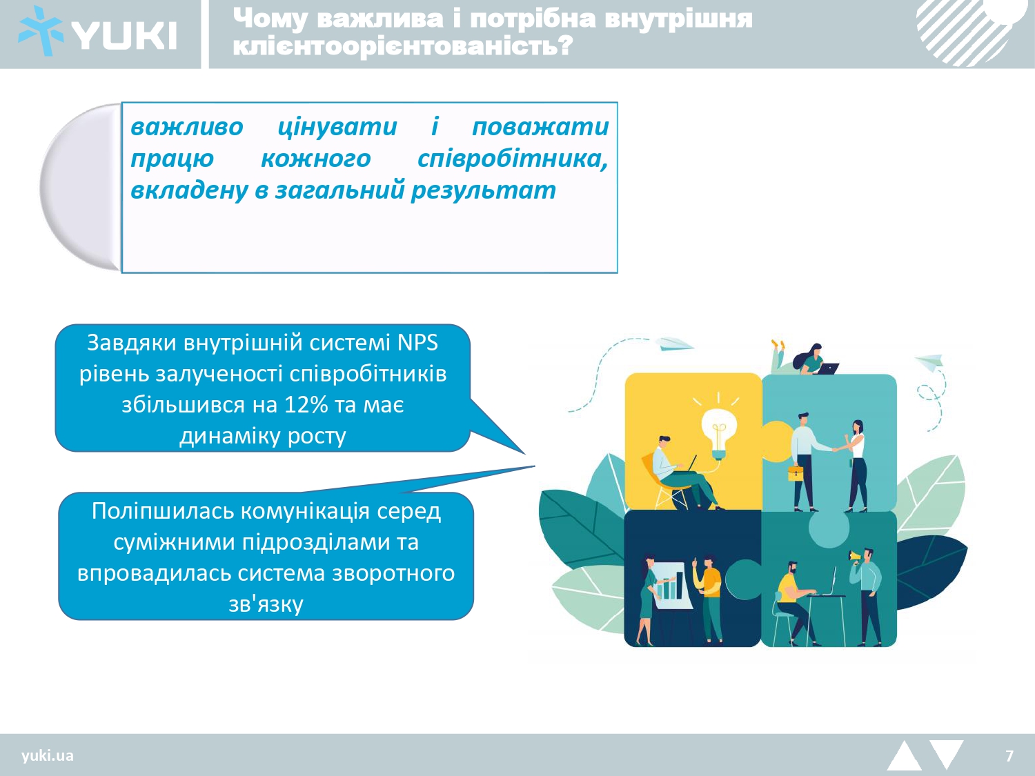 Завдяки внутрішній системі NPS, рівень залученості співробітників збільшився на 12% та має динаміку росту. Поліпшилась також комунікація між суміжними підрозділами та впровадилась система зворотного зв’язку.