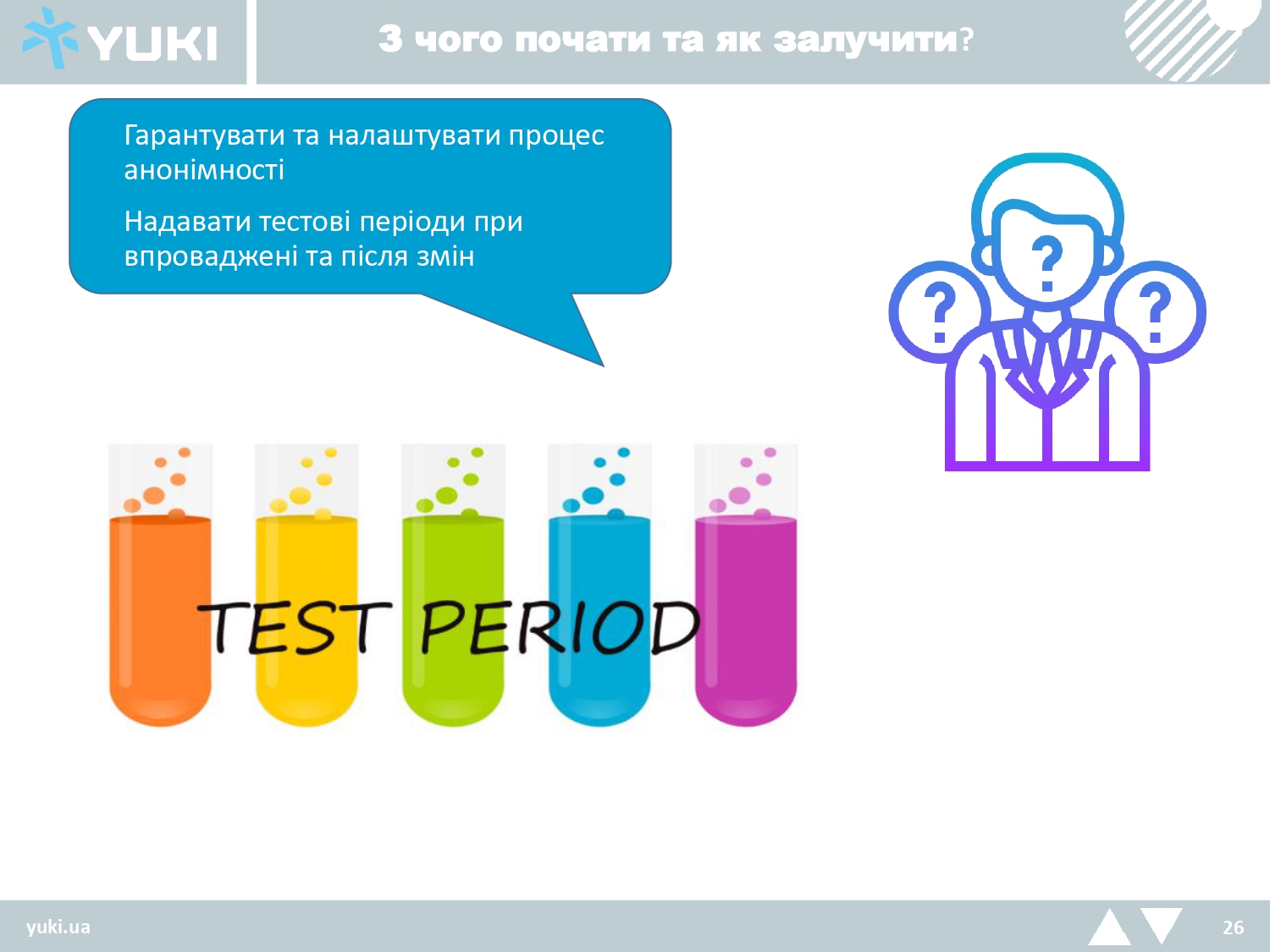 А також гарантувати та налаштувати процес анонімності та запропонувати тестові періоди при впроваджені та після змін.