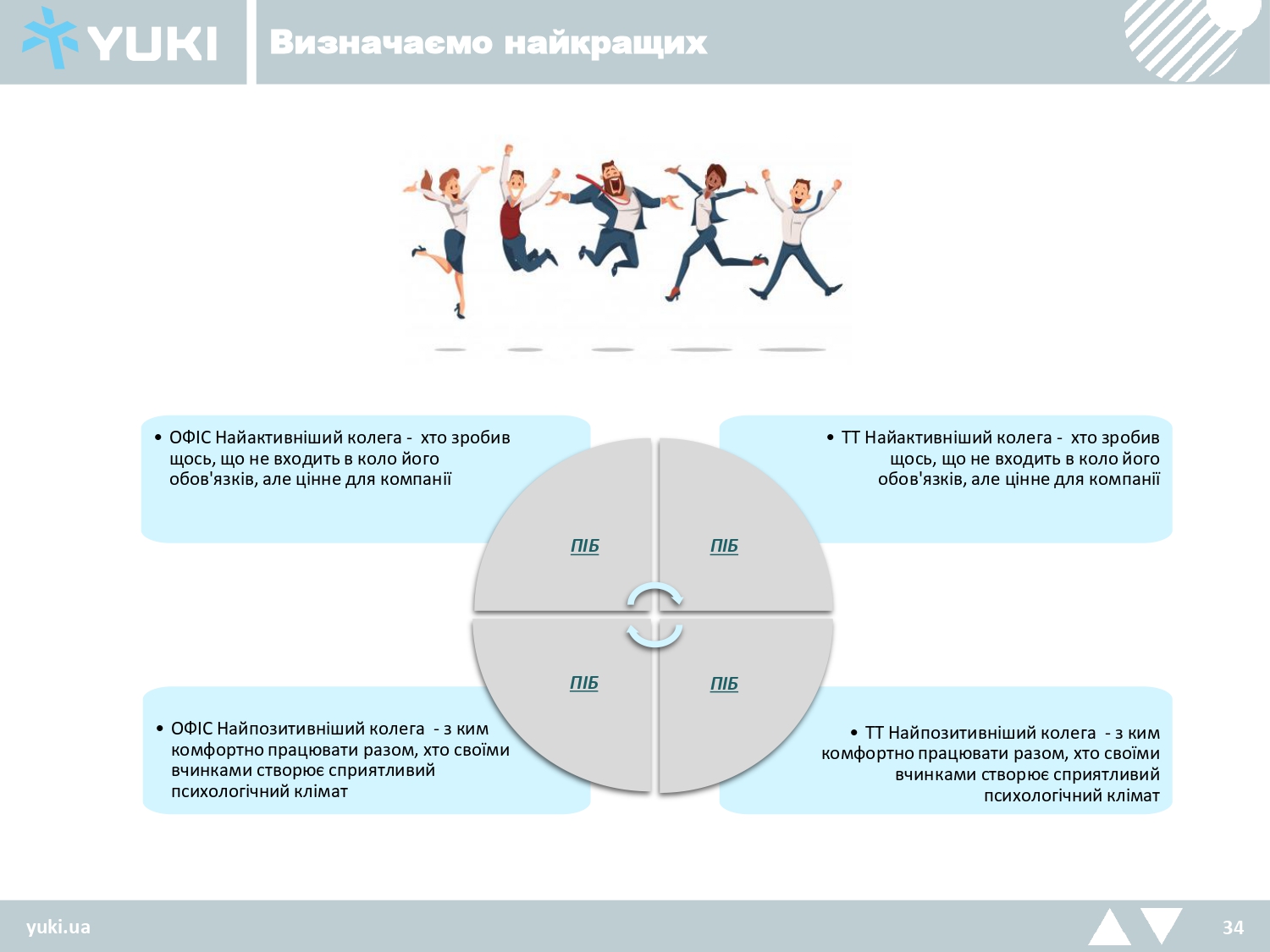 - Найактивніший колега – хто зробив щось, що не входить в коло його обов’язків, але цінне для компанії;