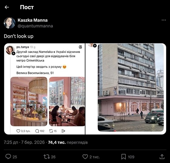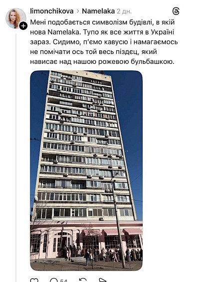 6 березня 2026 року в центрі Києва, поблизу станції метро «Олімпійська», відкрилася друга кондитерська мережі Namelaka. Попри масштабний успіх на старті, проєкт опинився в епіцентрі запеклих дискусій через радикальне візуальне рішення - рожевий фасад на базі радянської 16-поверхівки.