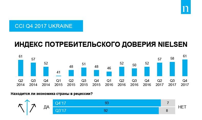 За підсумками четвертого кварталу 2017 року індекс склав 61 пункт (що на 3 пункти вище, ніж в ІІІ кварталі 2017 року, і на 9 пунктів, ніж в IV кварталі роком раніше). Такими є результати дослідження споживчої довіри The Conference Board Global Consumer Confidence Survey, підготовленого в співпраці з Nielsen.