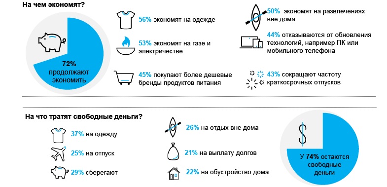 У 26% українських споживачів не залишається вільних коштів після покупки товарів першої необхідності. Ті, у кого вони залишаються, витрачають вільні гроші на новий одяг (37%), роблять заощадження (29%) і розважаються поза домом (26%).