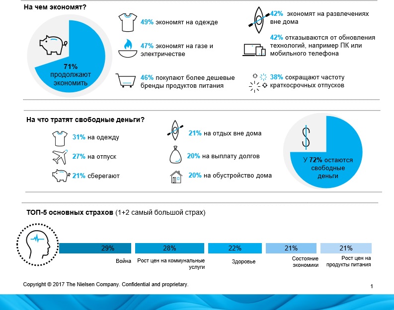 Дослідницька компанія Nielsen оприлюднила результати дослідження споживчих настроїв в країні в першому кварталі 2018 року: на що українці готові витрачати вільні гроші та що їх найбільше турбує.