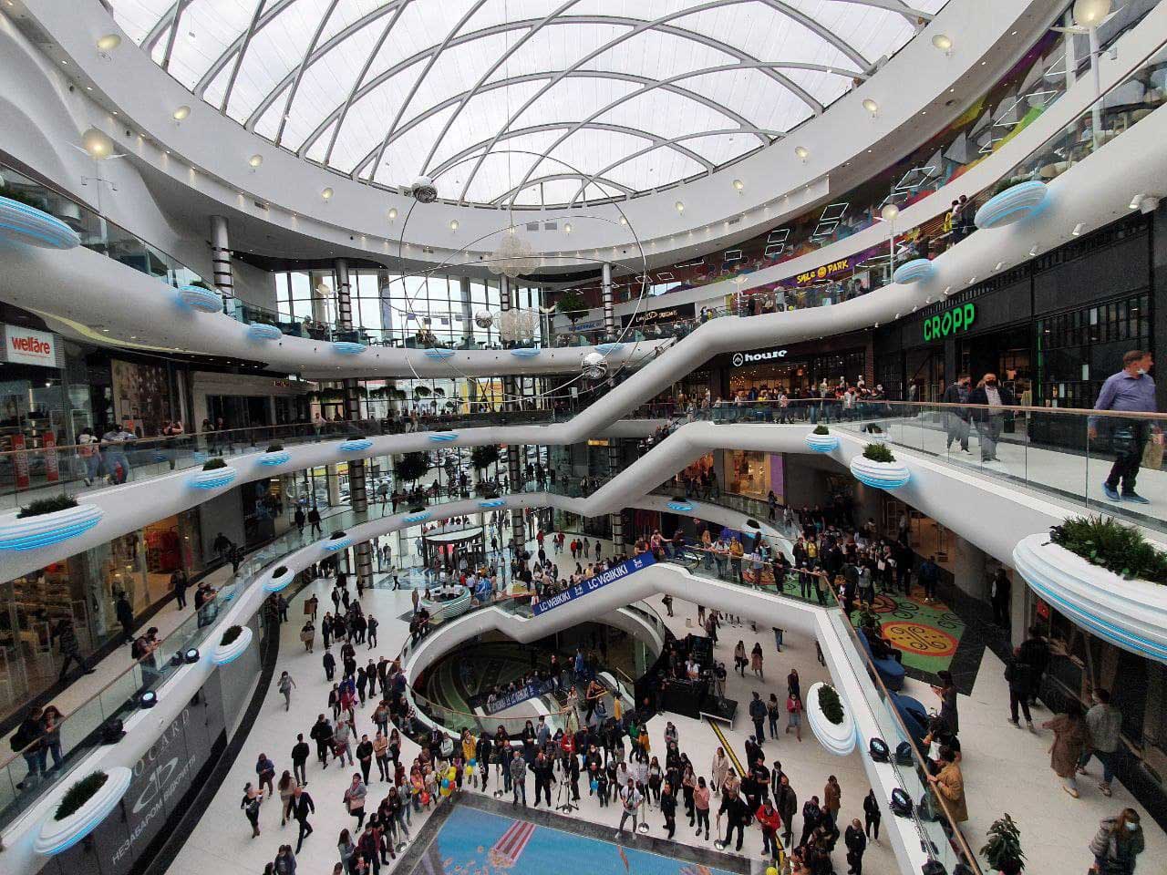 Між п’ятьмя рівнями торгово-розважального центру, якщо рахувати із мінус першим поверхом, встановили 28 ескалаторів і 14 ліфтів. Біля них влаштували розважальну програму з музикантами, розіграшами та аніматорами.