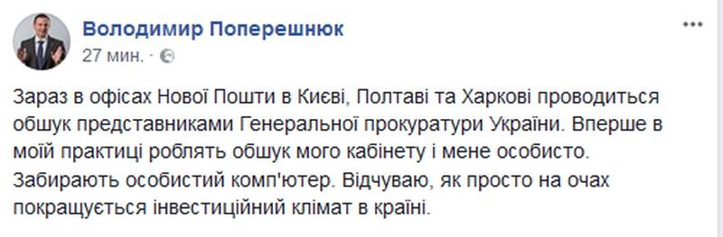 У п’ятницю, 16 березня, представники Генеральної прокуратури України прийшли з обшуками в офіси найбільшого приватного поштового оператора країни Нова пошта. На своїй сторінці в соціальній мережі Facebook співзасновник компанії Володимир Поперешнюк пише: “Зараз в офісах Нової Пошти в Києві, Полтаві та Харкові проводиться обшук представниками Генеральної прокуратури України. Вперше в моїй практиці роблять обшук мого кабінету і мене особисто. Забирають особистий комп’ютер. Відчуваю, як просто на очах покращується інвестиційний клімат в країні”.