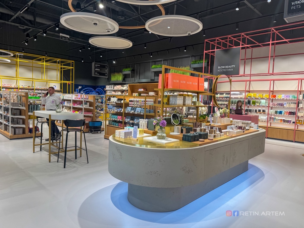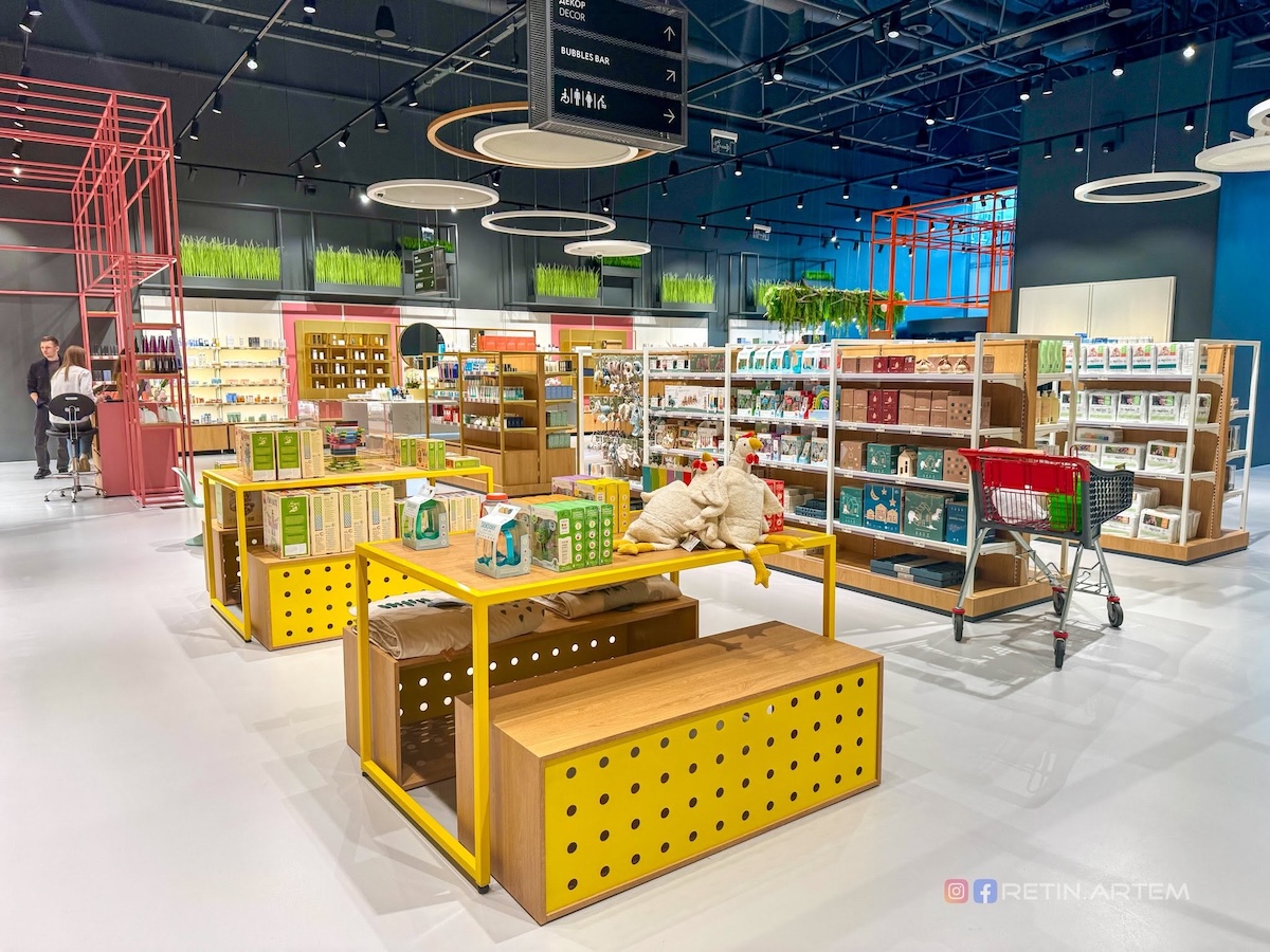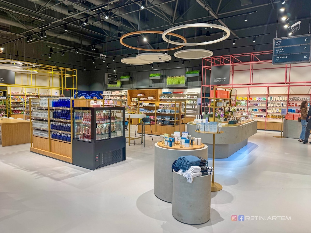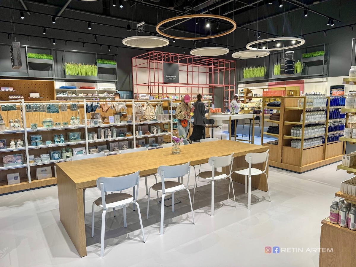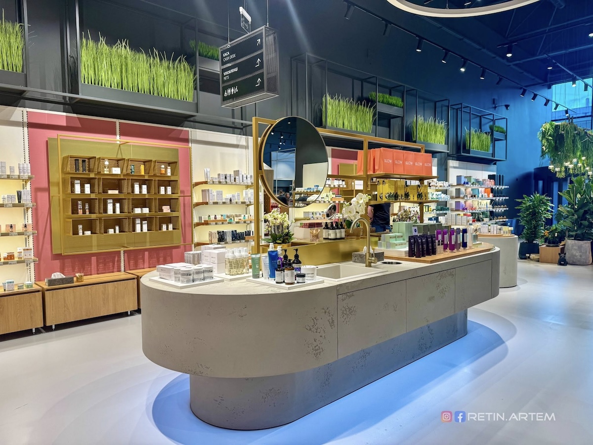 Озеленення (у тому числі підвісне) додає «живого» ефекту, а дзеркала з цитатами, м’яке освітлення й інстаграмні «острівці» з товарами створюють дружню, сучасну атмосферу.