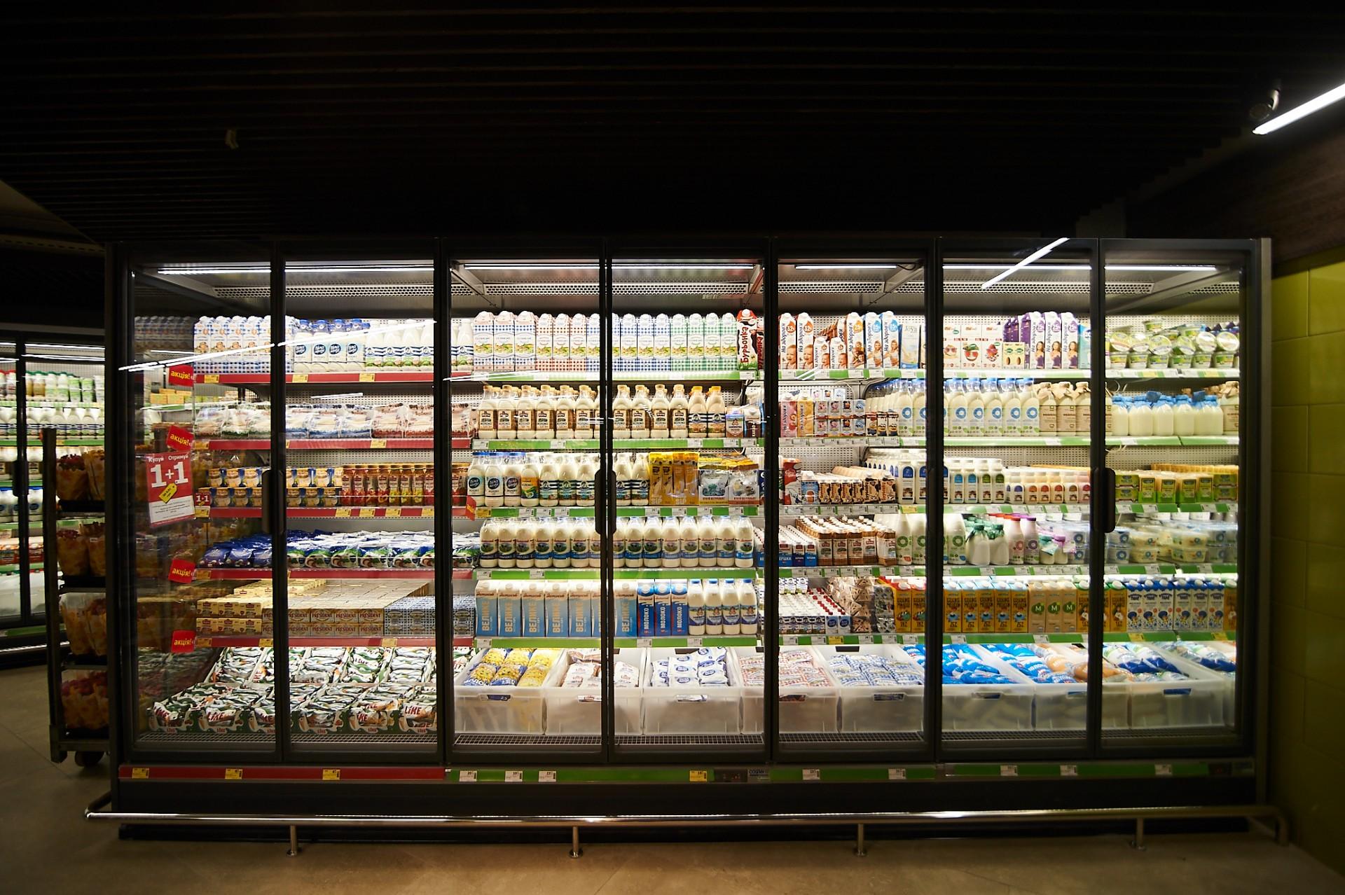 Магазин обладнаний новітнім холодильним обладнанням і стелажами.