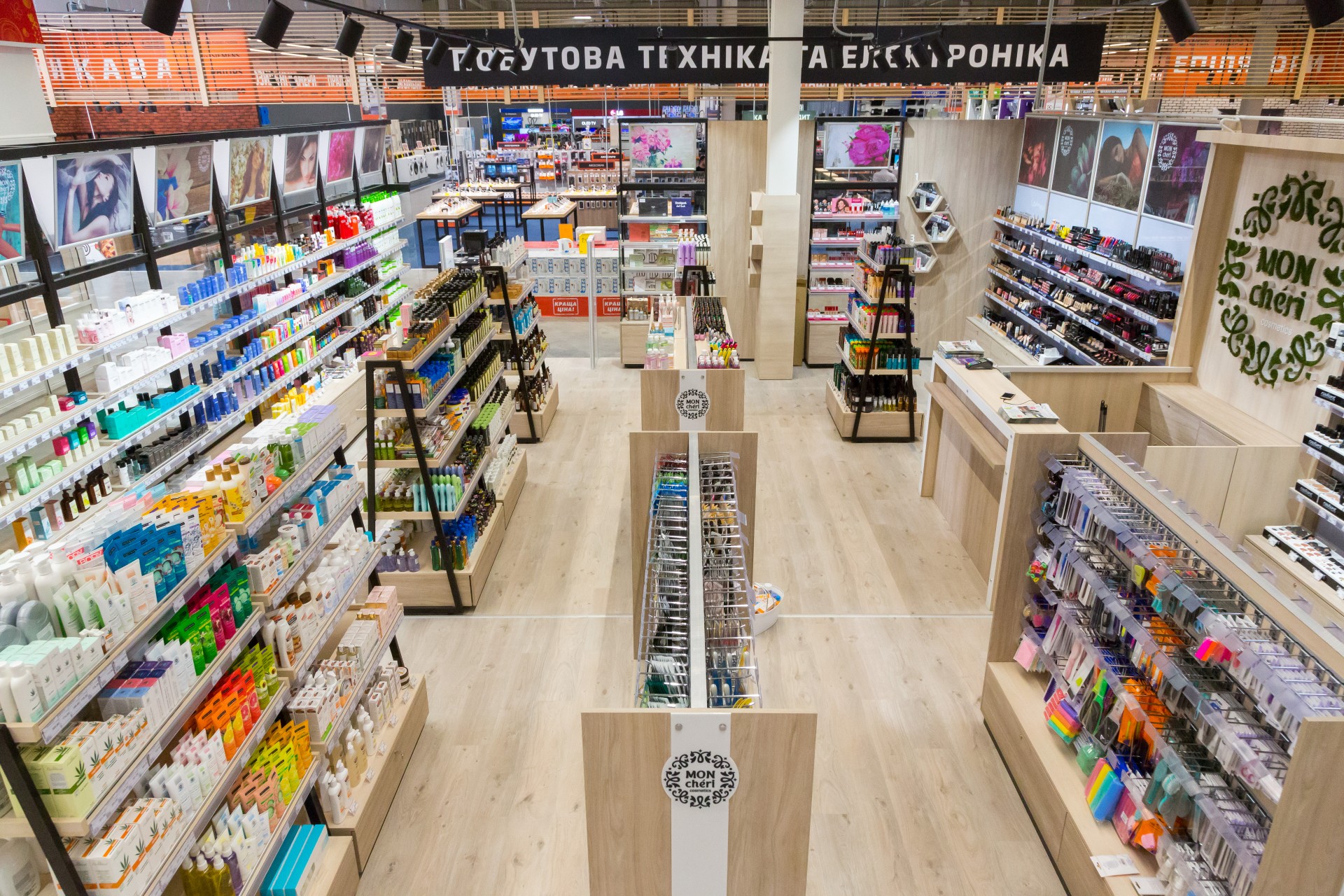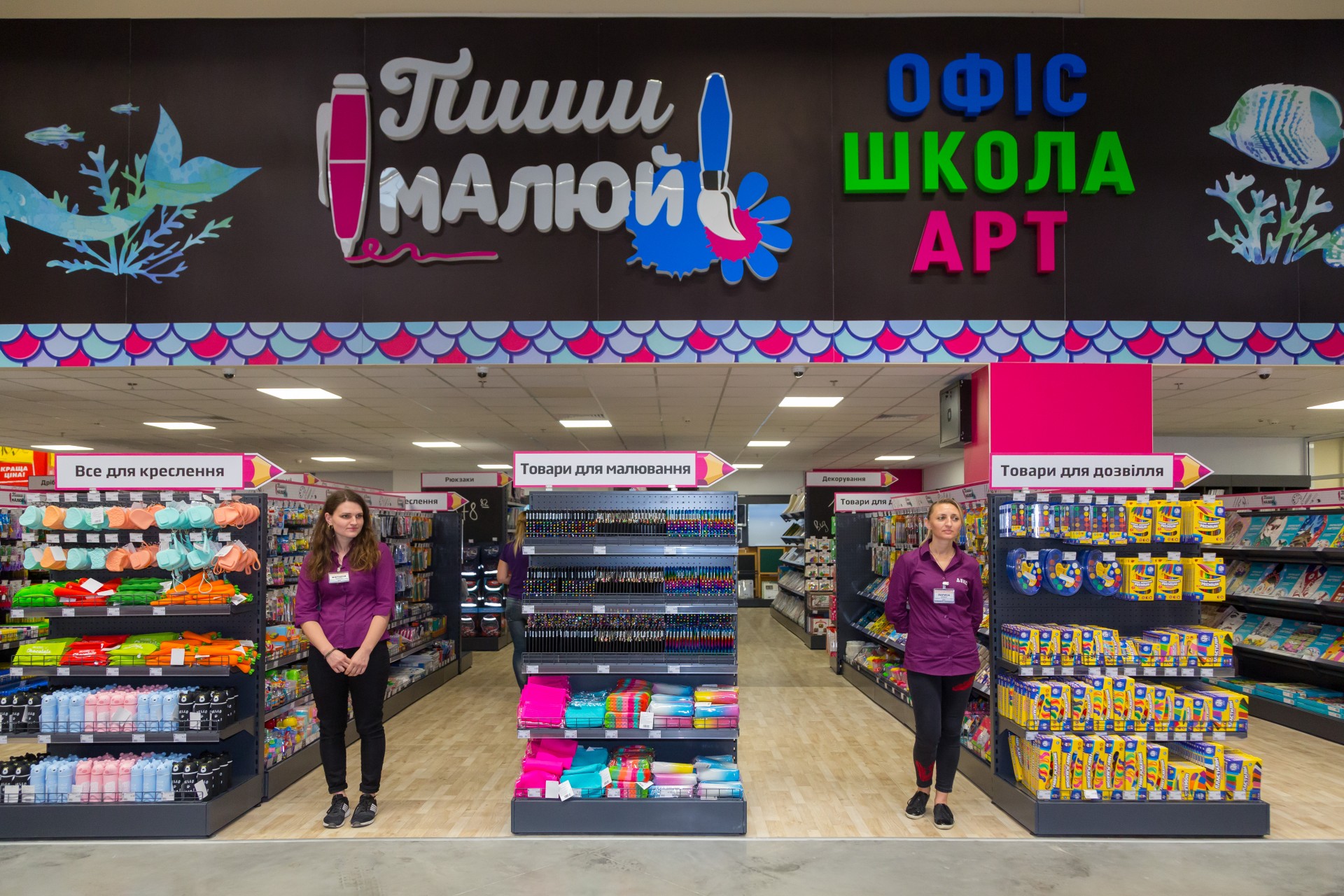 У новому для компанії магазині Mon Cheri можна придбати величезний асортимент декоративної косметики та засобів по догляду за волоссям, обличчям та тілом. А в торговельній зоні “Пиши-Малюй” – товари для офісу, школи та творчості.