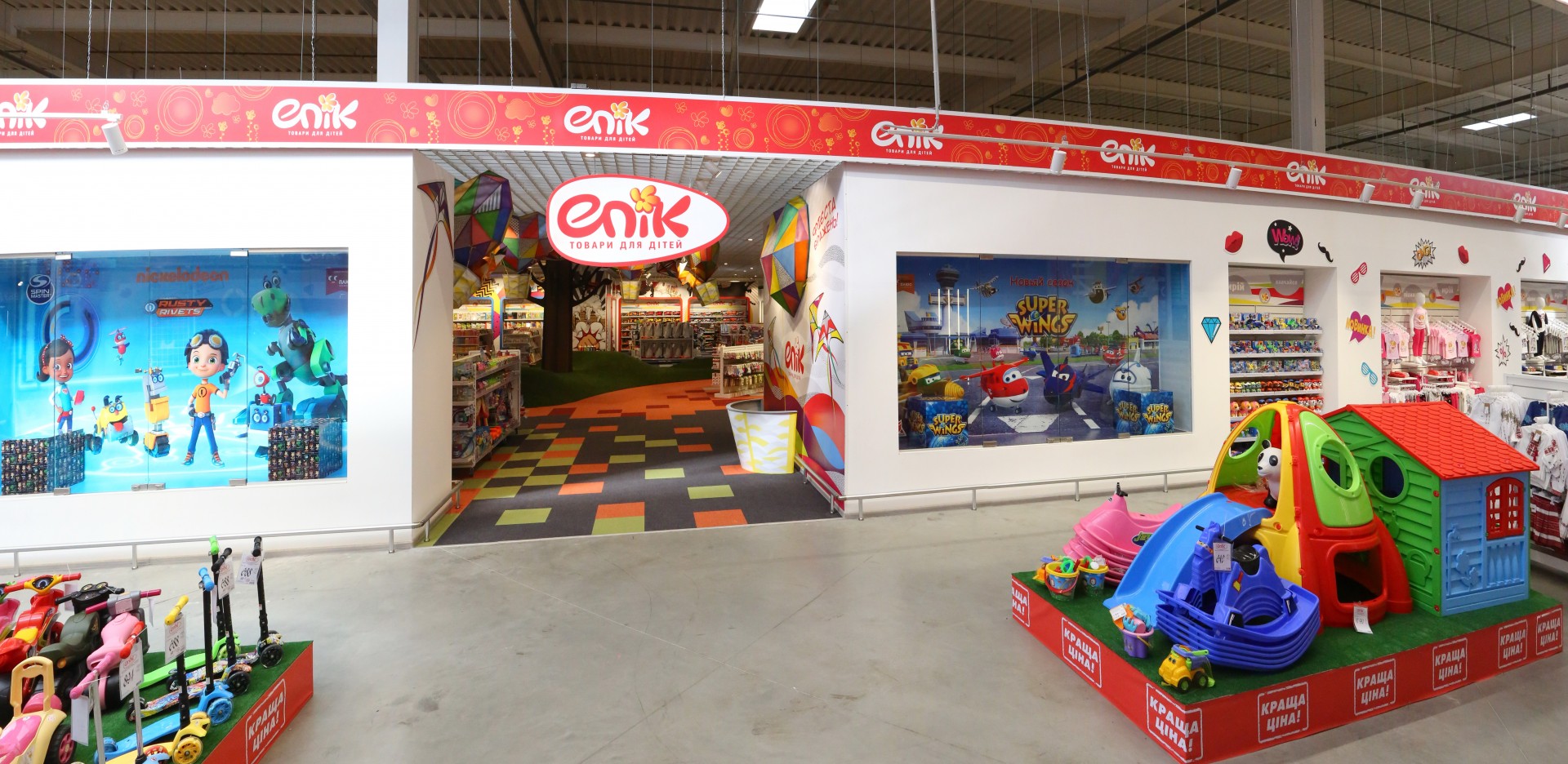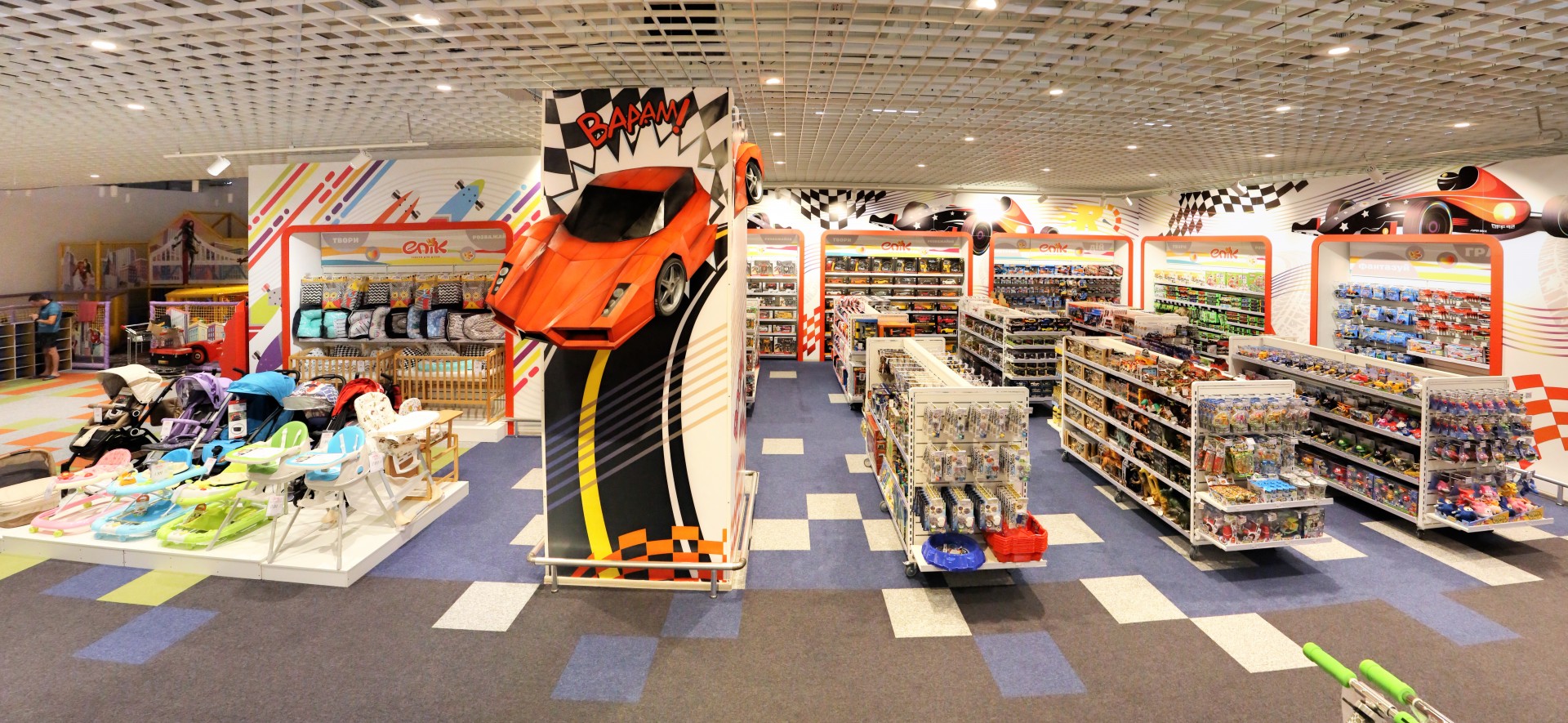 Магазин дитячих товарів Епік займає площею 1700 кв. м, і пропонує не тільки кращі товари для дітей, а й зони відпочинку, творчості, батути та інші розваги.