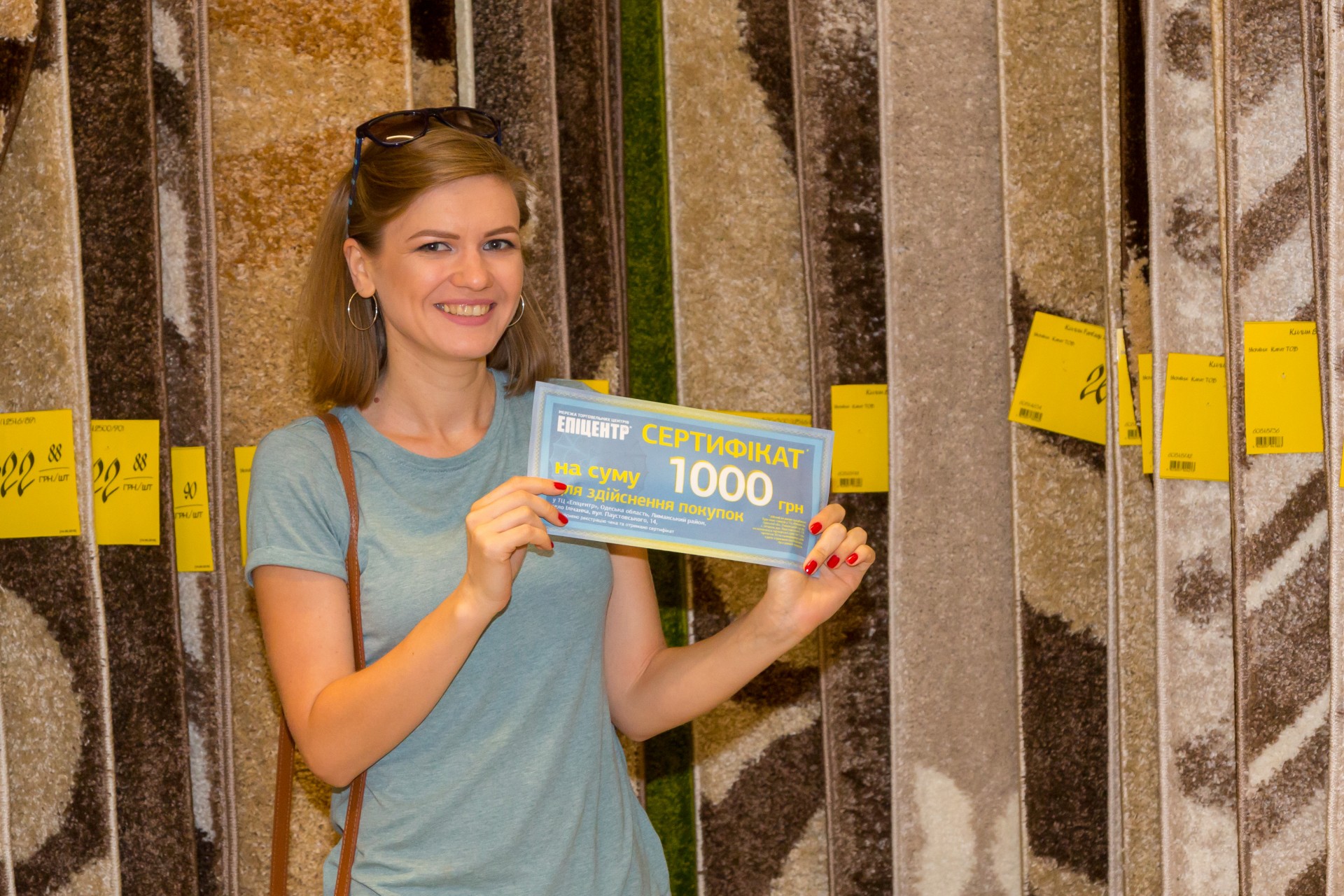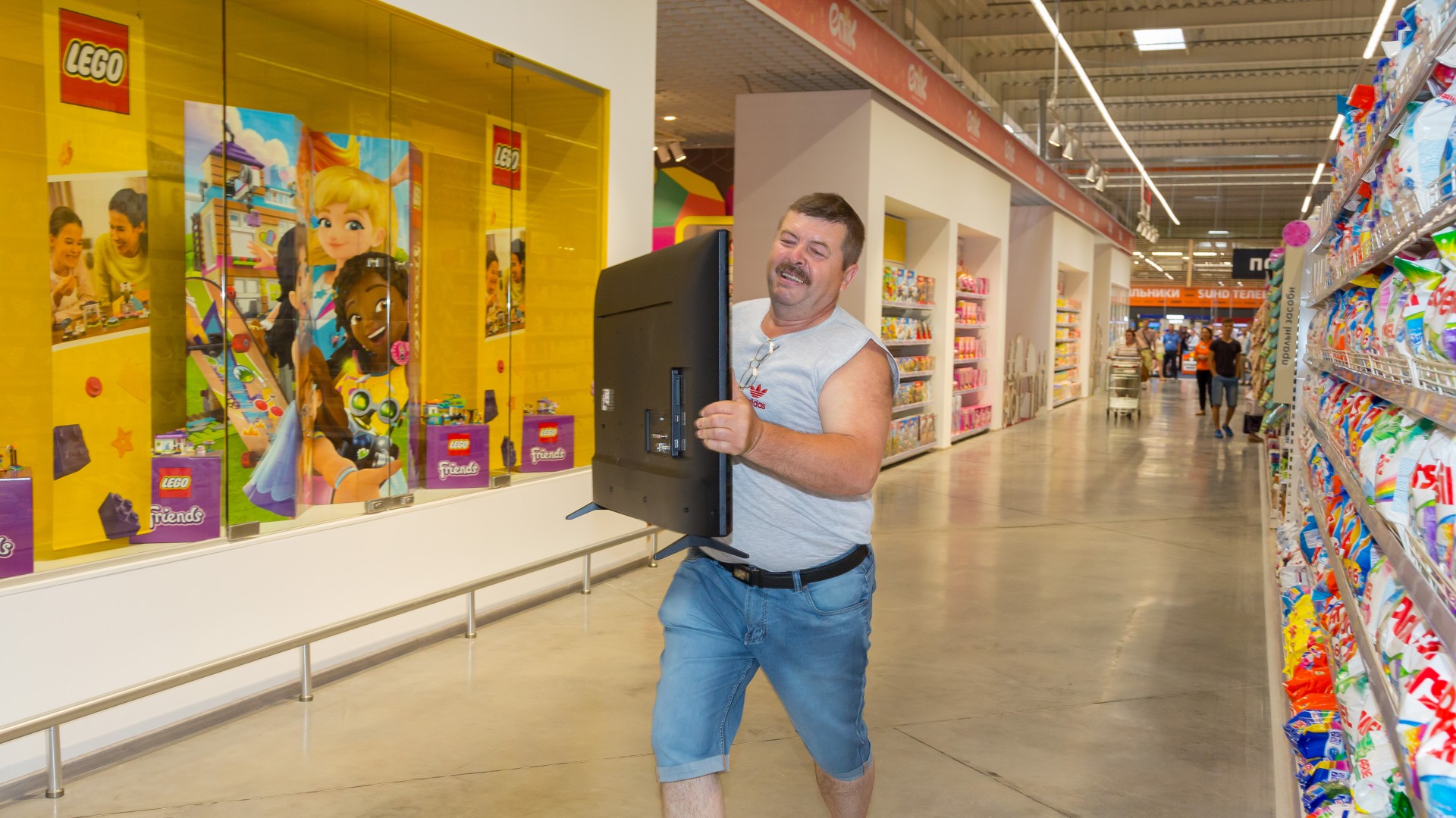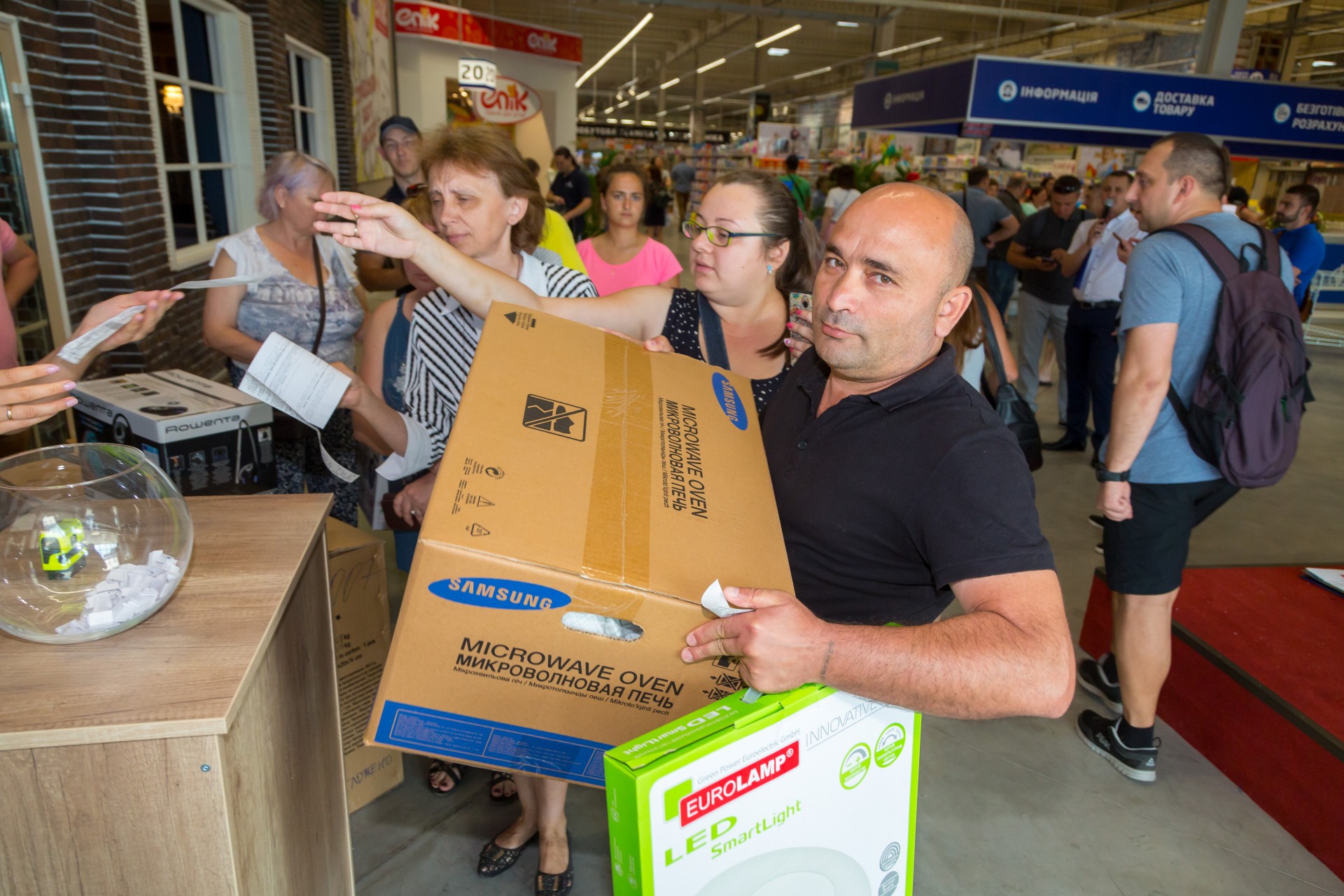 На честь відкриття нового ТЦ компанія підготувала для відвідувачів цілий ряд акцій та розіграшів. Так, перший покупець отримав можливість протягом хвилини винести з торгового залу максимум товару. Вибір пав на телевізор.