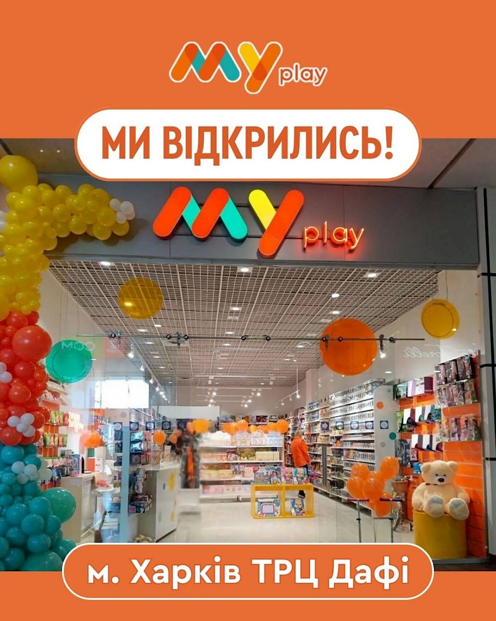 Магазин дитячих магазинів MYplay повернувся в харківський ТРЦ Дафі. «Ми переїхали з 3 поверху на 1, щоб вам було ще зручніше заходити за радістю», - йдеться в повідомлені ритейлера. Загалом, мережа має 14 магазинів в 9 містах України.