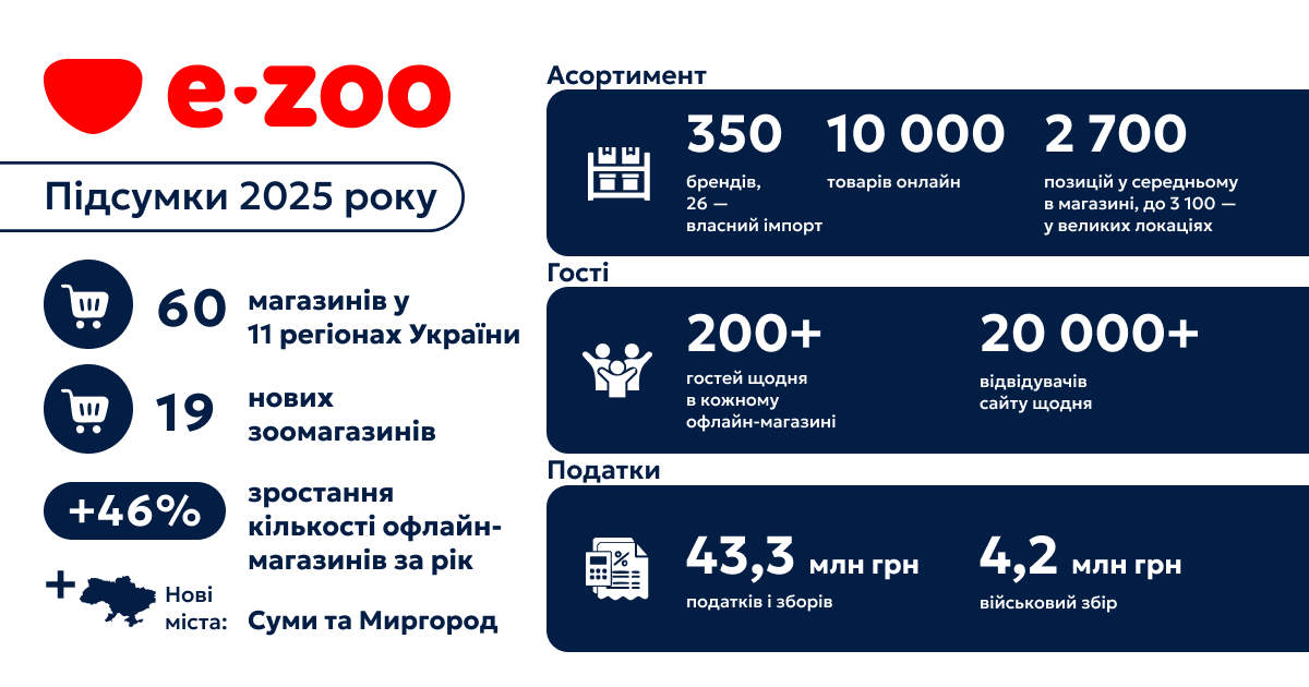 Мережа зоомагазинів E-Zoo упродовж 2025 року відкрила 19 нових зоомагазинів, збільшивши кількість локацій на 46%. Згідно з повідомленням ритейлера, що входить до складу Fozzy Group та працює в омніканальному форматі, нові локації E-Zoo з’явилися у Києві та Київській області, Полтаві, Одесі, Львові та Рівному, а також вперше в Сумах та Миргороді. Тепер мережа працює в 11 регіонах України та має 60 зоомаркетів, більшість з яких — у великих торговельних центрах.