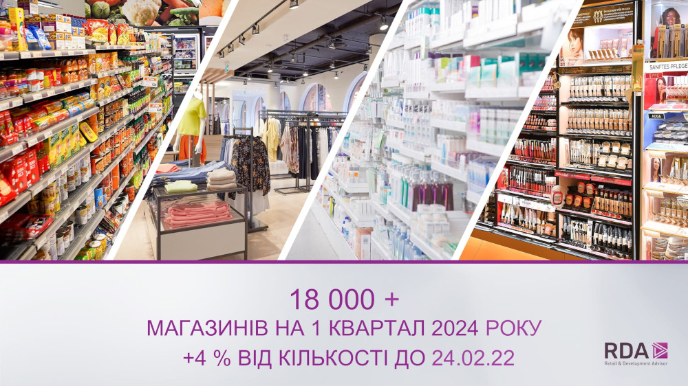 За підсумками I кварталу 2024 року кількість магазинів, які працюють в Україні перевищила довоєнний показник. Відповідні дані RDA презентувала в рамках дослідження українського ринку роздрібної торгівлі у 2023-24 роках. І таке динамічне зростання кількості магазинів відбувалося з середини 2023 року та на початку 2024-го. При цьому найактивніше зростали мережі формату one dollar store, продуктові ритейлери, а також сегменти drogerie/pharmacy та fast-fashion.