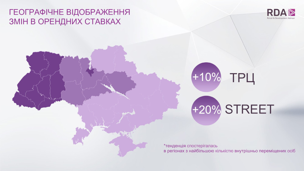 Цікаво, що найбільша активність серед торгових мереж спостерігалася в областях з високою концентрацією внутрішньо переміщених осіб. Таким чином ритейлери логічно реагували на збільшення кількості споживачів у регіонах, а девелопери змогли відновити рівень орендних ставок подекуди до рівня довоєнних. В областях з високою кількістю переселенців орендні ставки у торгових центрах за рік зросли до 10%, а в стріт-ритейлі – до 20%.