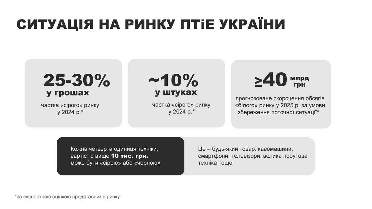 Прогнозоване скорочення обсягів «білого» ринку у 2025 році, за умови збереження поточної ситуації, перевищить понад 40 млрд грн. Умовно кажучи, за відсутності реальних позитивних зрушень в цьому питанні кожна четверта одиниця техніки, вартістю вище 10 000 грн, буде «сірою» або «чорною». Це – будь-який товар, як-от кавомашини, смартфони, телевізори, велика побутова техніка тощо.