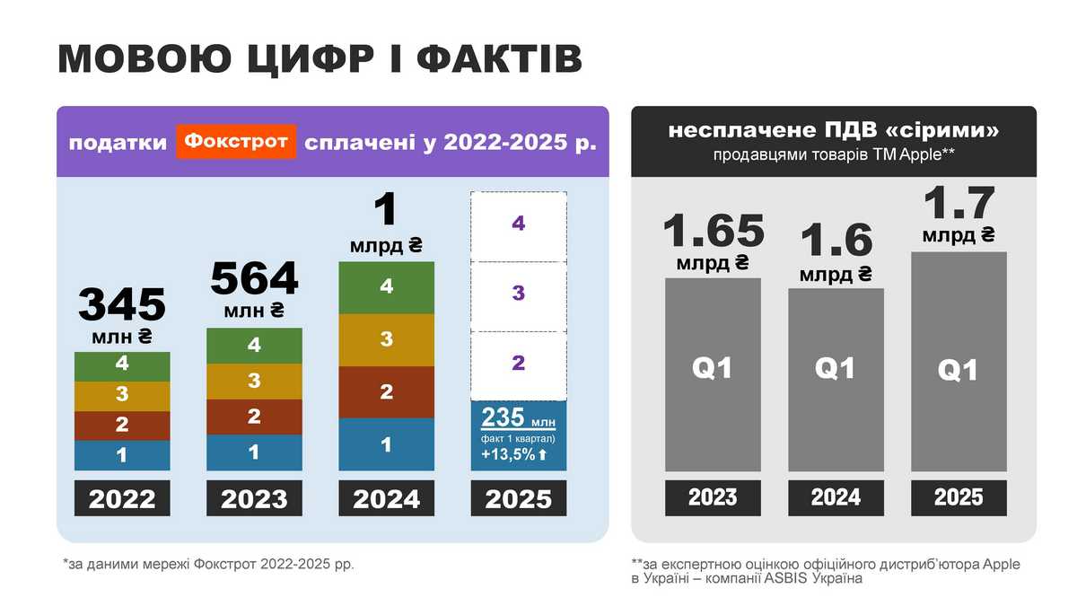 Для порівняння: Фокстрот як один з найбільших платників податків у галузі електроніки з початку повномасштабної війни сплатив понад 2 млрд грн. З них – ПДВ на імпорт 766 млн грн (166 млн грн у 2022 р., 248 млн у 2023 р., 305 млн – у 2024 р.). Майже 50 млн грн – у І кварталі 2025 року.