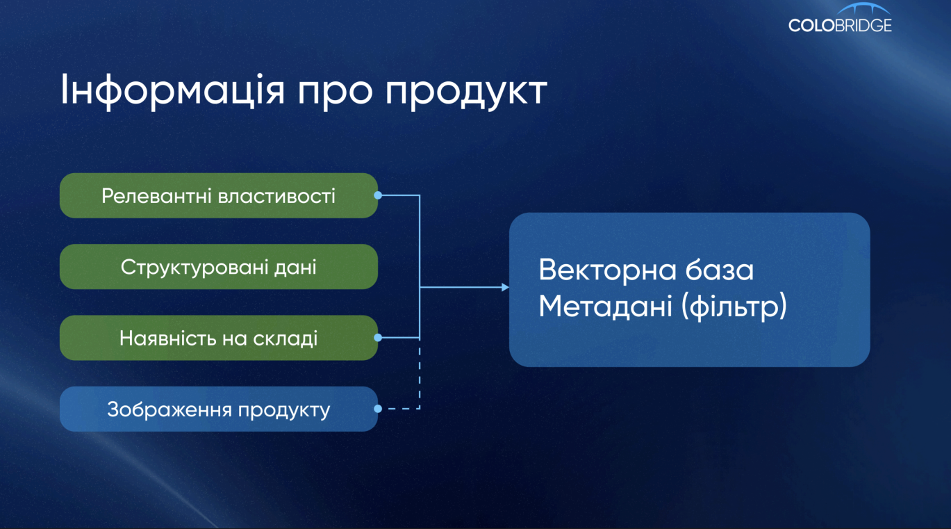 Каталог продуктів переводиться у векторну базу даних, де всі релевантні властивості продукту структуруються та збагачуються метаданими. Це забезпечує актуальність інформації про ціни та наявність.
