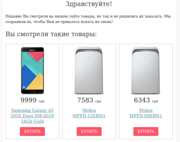 Тоді це буде не: «Здрастуйте, це компанія Роги і копита, хочемо запропонувати вам стільці» (хоча клієнт був в розділі кліматичної техніки), а: «Здрастуйте, Юлія, жарко, літо, давайте ми вам кондиціонер привеземо і встановимо. Для вас ми підібрали 3 моделі: А за Х грошей, В за 1,5х грошей, С за 3Х грошей. Рекомендуємо придивитися до В-моделі. Вона в наявності».