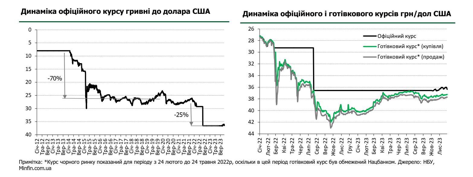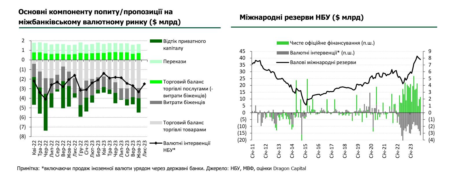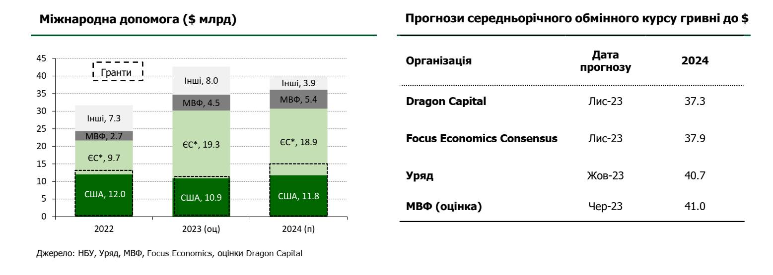 При умові збереження обсягів фінансової підтримки в 2024 році, в першу чергу з боку США та ЄС, під егідою МВФ, обсяги міжнародної допомоги й надалі перевищуватимуть інтервенції НБУ, а резерви – зростатимуть. Що може створити умови для подальшого послаблення валютних обмежень. Зважаючи, що НБУ тримає валютний ринок під контролем, суттєвої девальвації гривні не очікується. 2024 року прогнозується середньо-річний курс на рівні 37,3 грн/$ та 39,0 грн/$ на кінець року. Хоча прогнози уряду традиційно більш консервативні – в бюджет закладено курс на рівні майже 41 грн/$.