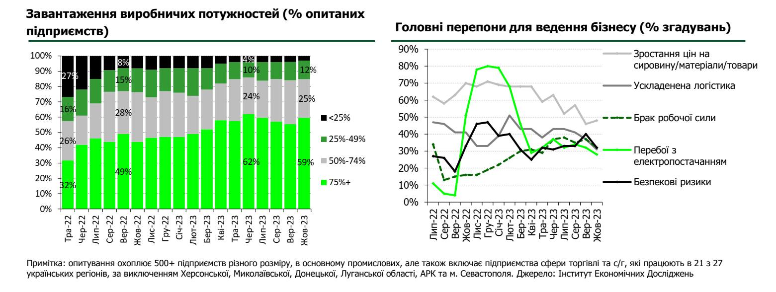Покращення видно й по інших показниках, таких як завантаженість потужностей переробних підприємств. Завантаженість виробничих потужностей швидко зростала в перші місяці після повномасштабного вторгнення рф та на початку 2023 року. В червні 2023 року 62% підприємств мали завантаженість більше 75%, ще 24% працювали на рівні 50-74%, і тільки 4% були завантажені на чверть чи нижче.