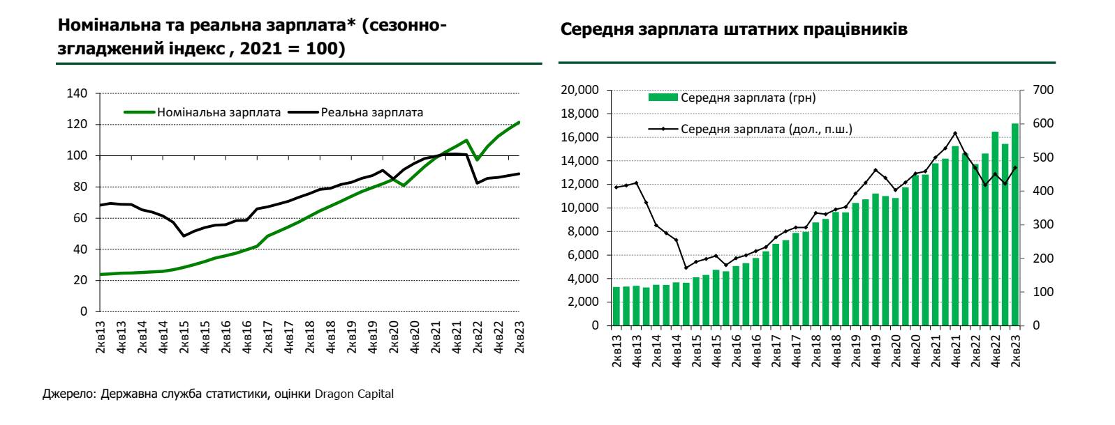 Після падіння на початку війни номінальна середня зарплата стрімко зростала у 2023 році й станом на середину року вже перевищувала довоєнний рівень на 20%. Реальна оплата праці (коригована на інфляцію) також демонструвала послідовне збільшення, але вона досі залишається на 12% нижче довоєнного рівня через минулорічну високу інфляцію. Виходячи із офіційної статистики, ми оцінюємо зростання номінальної зарплати в 2023 році на 15% р/р, до $470 в еквіваленті і прогнозуємо збільшення у 2024-му ще на 13%, до $519.
