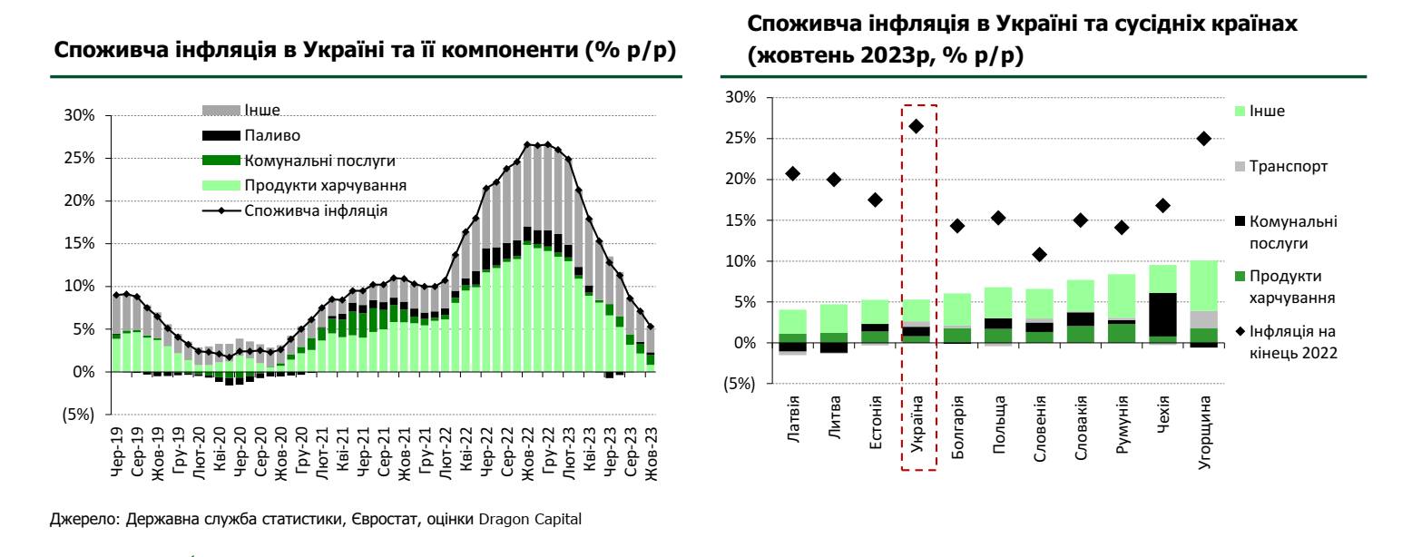 Споживча інфляція стрімко знижувалась впродовж всього 2023 року: до 5,3% р/р в жовтні з 26,6% в грудні 2022 року. Валютно-курсова стабільність зіграла важливу роль у тамуванні інфляції. До того ж, збільшилась пропозиція окремих продуктів харчування, зокрема, овочів, фруктів та окремих круп завдяки сприятливій погоді. При цьому виробничі витрати бізнесу стабілізувались після періоду різкого зростання, а вартість більшості комунальних послуг для населення залишилась фіксованою.