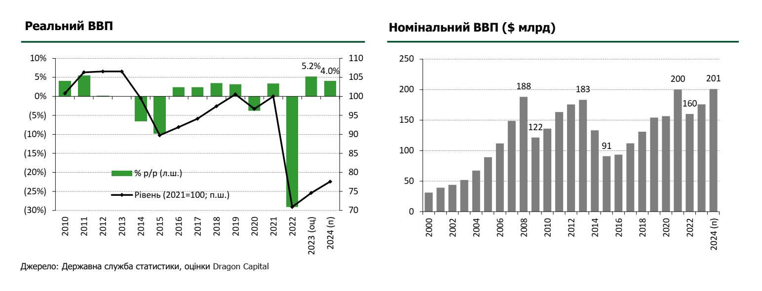 Варто зазначити, що очікуване відновлення протягом 2023-24 років не компенсує падіння на 29% у 2022-му. Тому українська економіка залишиться приблизно на 22% нижче довоєнного рівня. Проте номінальний ВВП, виражений у доларах США, може досягти свого довоєнного рівня в $200 млрд вже 2024 року завдяки відносній стабільності валютного курсу.