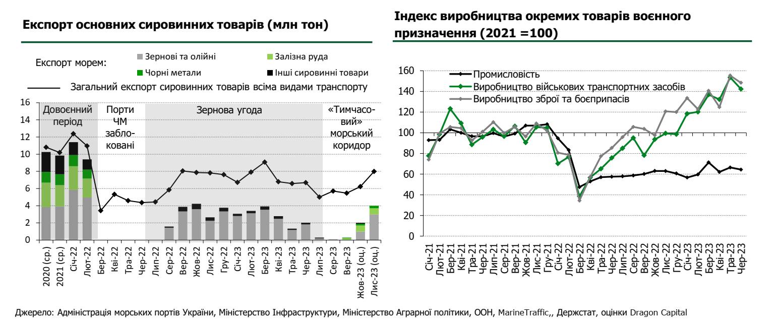 Основними рушійними силами відновлення економіки у 2024 році можуть стати відновлення експорту морськими портами через «тимчасовий» коридор та розвиток ВПК. Зокрема, тільки в листопаді минулого року експорт сировинних товарів морськими портами сягнув 4 млн тонн, а експорт всіма видами транспорту, ймовірно, досяг рівня найкращих місяців дії «зернового коридору».