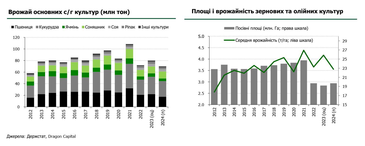 Незважаючи на втрату частини посівних площ через війну (скорочення у 2023 році продовжилось до 19,2 млн га), завдяки сприятливим погодним умовам і розвантаженню складів під час дії «зернового коридору» Україна отримала рекордний врожай зернових та олійних культур – на рівні 80 млн тонн. Це на 11% більше, ніж у 2022-му. Проте надзвичайно сприятливі погодні умови навряд чи повторяться другий рік поспіль, тому в 2024-му врожай може бути меншим, і сектор АПК, який генерує 10-15% ВВП, вже навряд чи буде рушієм економічного зростання.