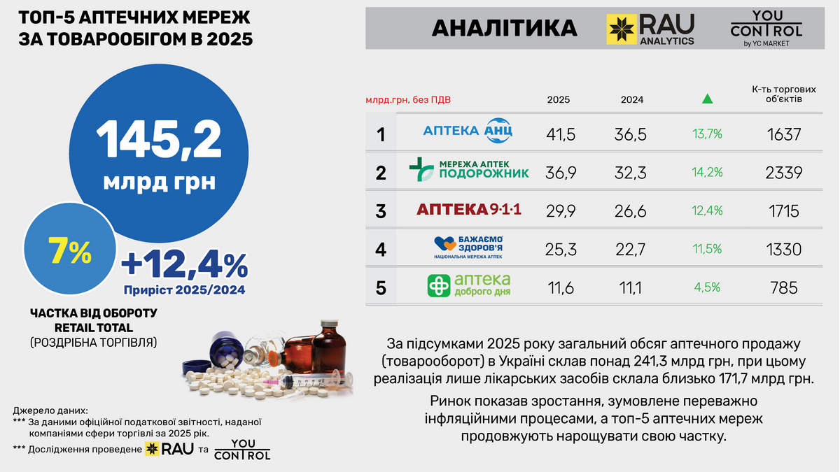 Спостерігається певний дисбаланс: у великих містах кількість аптек зростає, а в інших регіонах — зменшується. За підсумками 2025 року загальний обсяг аптечного продажу (товарооборот) в Україні склав понад 241,3 млрд грн, при цьому реалізація лише лікарських засобів склала близько 171,7 млрд грн. Ринок показав зростання, зумовлене переважно інфляційними процесами, а топ-5 аптечних мереж продовжують нарощувати свою частку.