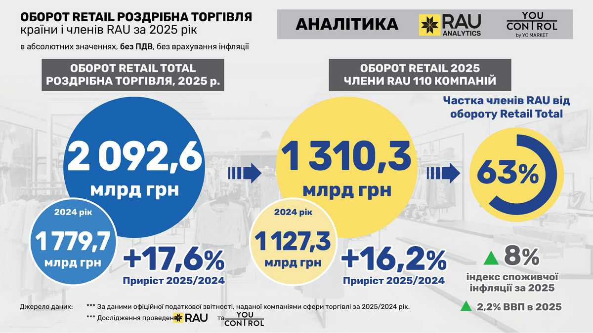 Як показують результати дослідження RAU, проведеного спільного з YouControl (продукт YС.Market) по оборотах галузі, минулого року українські ритейлери загалом отримали виторг в 2,09 трлн грн (без ПДВ). Що в абсолютних цифрах, тобто без урахування впливу інфляції, перевищило показники 2024-го на 17,6%. Власне члени RAU забезпечили 63% від цього обороту, або 1,3 трлн грн. Це на 16,2% більше, ніж у 2024 році.