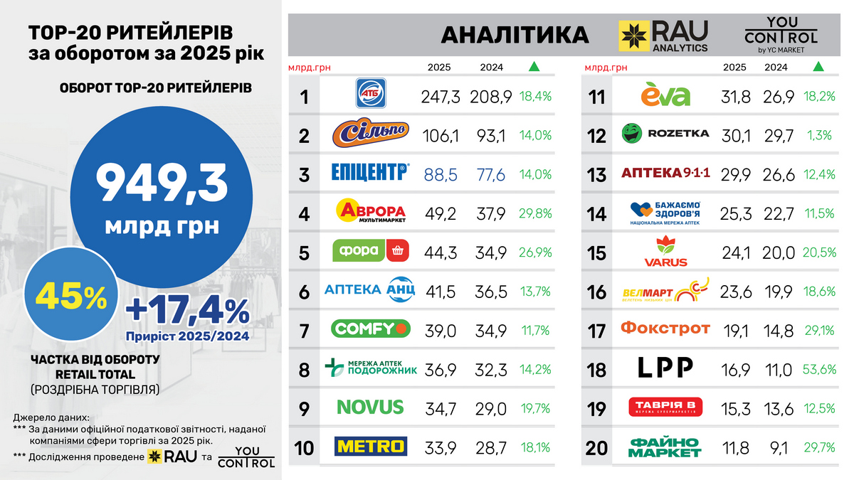 RAU Analytics: найбільші ритейлери за виручкою у 2025 році та темпи зростання ключових сегментів роздрібної торгівлі