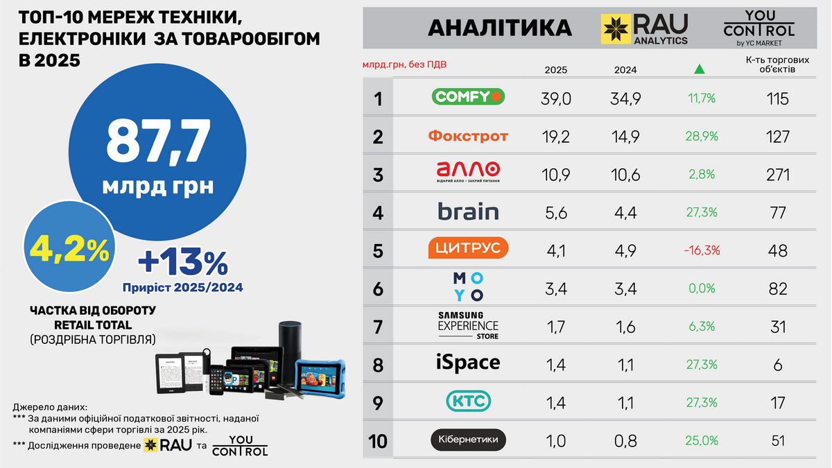На другому місці за розміром обороту мережа Фокстрот (ТОВ «ФТД-Ритейл») з показником у 19,2 млрд грн. Це вдвічі менше за Comfy, але Фокстрот показав найвищі темпи приросту виторгу за 2025 рік – на рівні 29,7%.